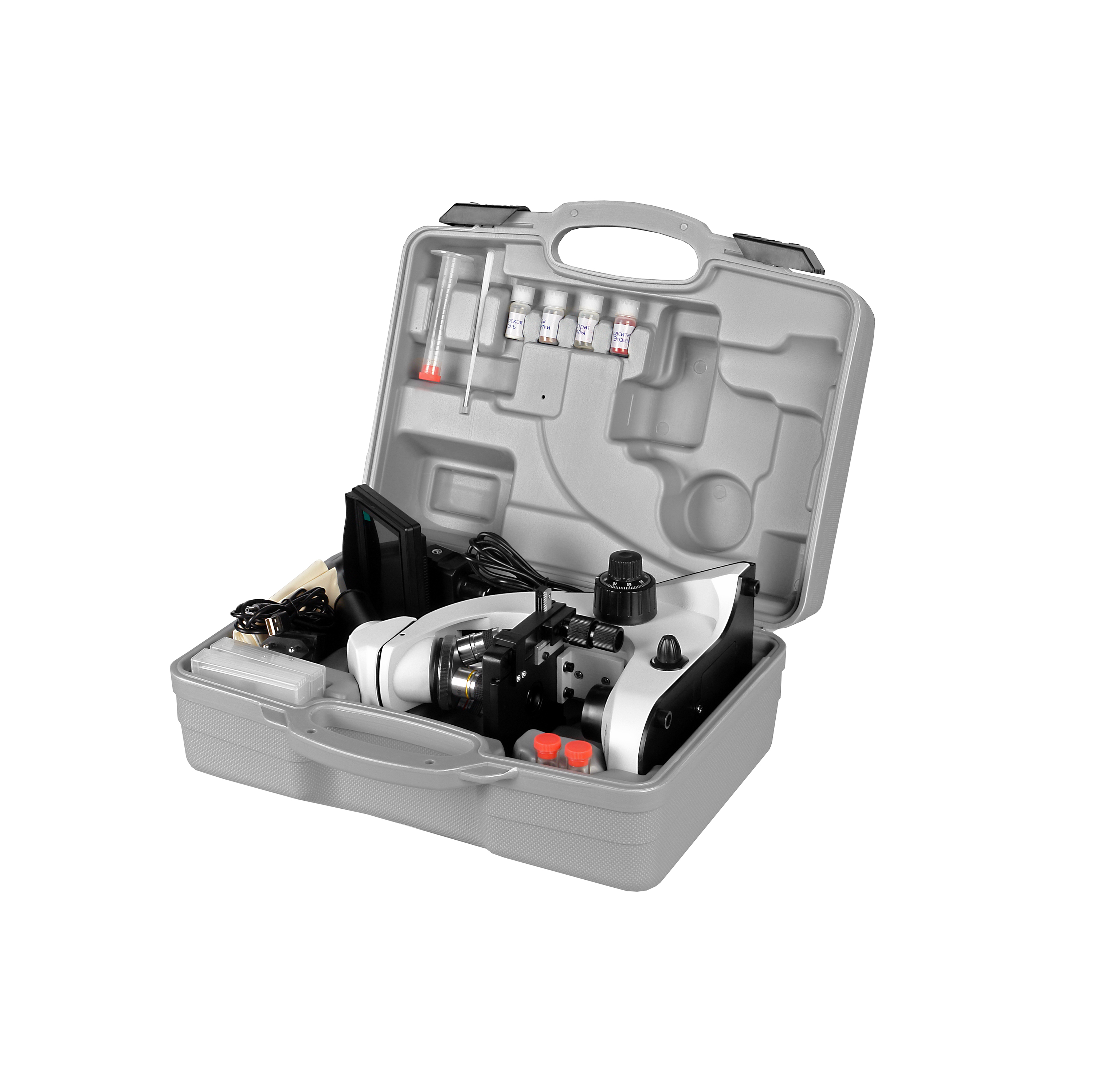 - Штатив со встроенным в основание LED осветителем проходящего света, LED осветителем отраженного света, револьверным устройством на 4 объектива и механизмом тонкой и грубой фокусировки