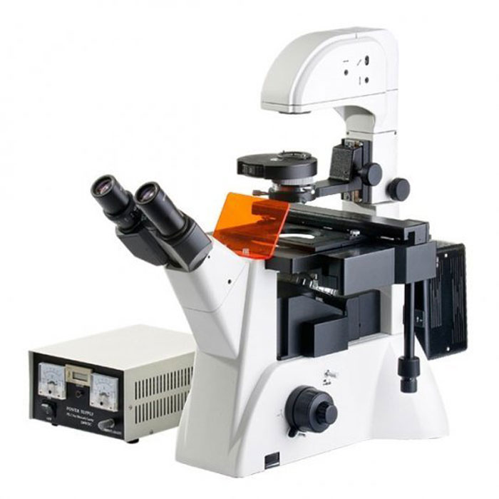 Двухкоординатный предметный столик оборудован не только препаратоводителем, но и держателями для чашек Петри и планшетов Терасаки. Для подсветки используется 30-ваттная галогенная лампа, а для люминесцентного освещения – ртутная лампа мощностью 100 ватт. Пользователь может плавно настраивать яркость подсветки с помощью регулятора в основании микроскопа.