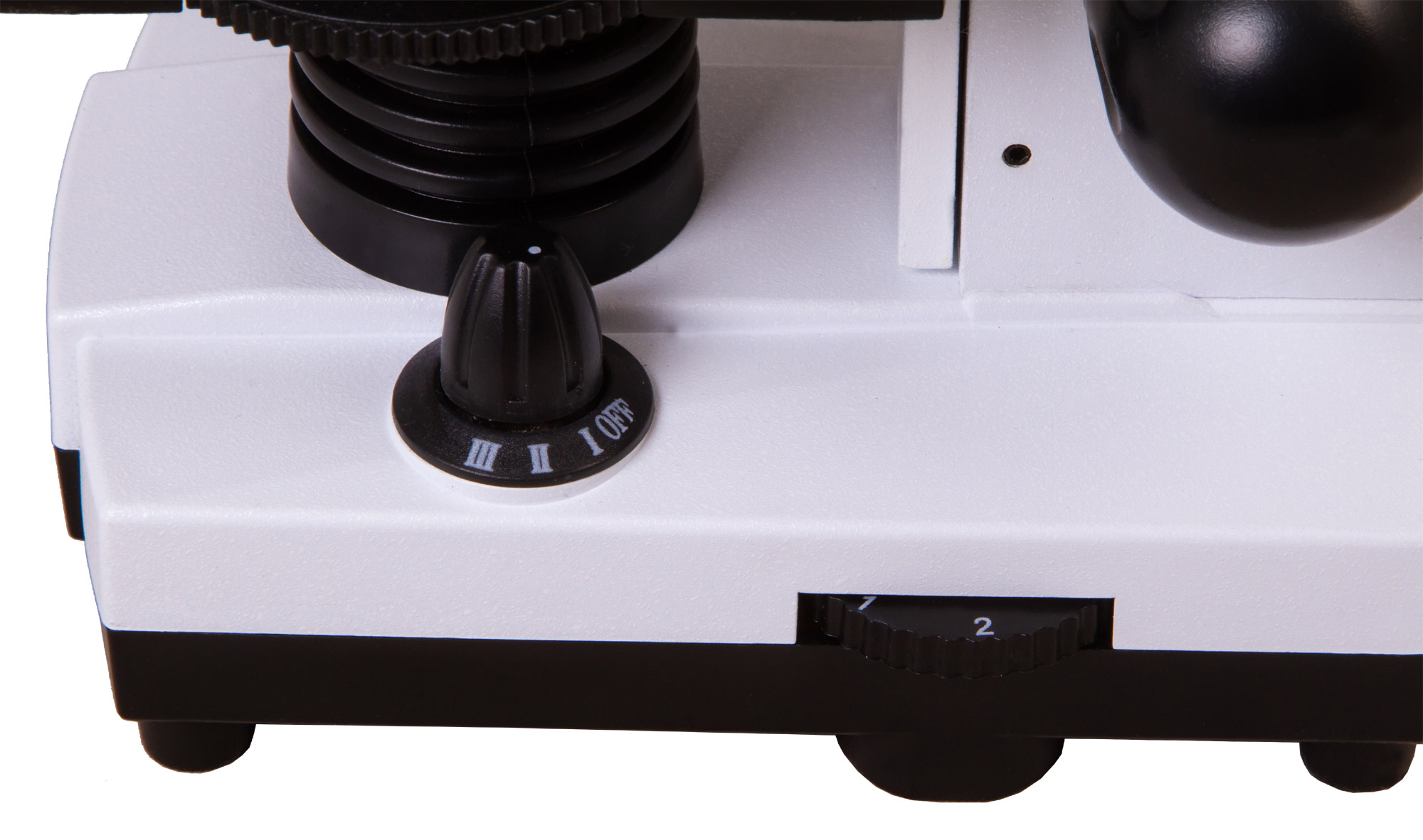 Положение предметного столика регулируется по высоте, есть зажимы для микропрепаратов. И над столиком, и под ним находится подсветка – светодиоды, которые можно включать вместе или по отдельности. Яркость подсветки регулируется. Для питания используются батарейки (в комплекте). Более точно настроить световой поток можно при помощи встроенного диска с диафрагмами.