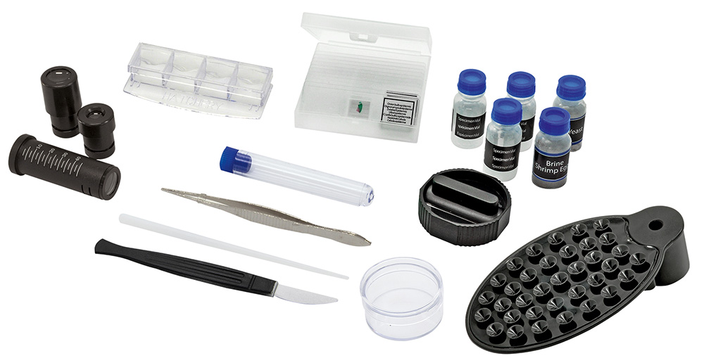 Набор для опытов, включенный в комплект, предназначен для самостоятельного разведения артемии (морского рачка), создания микропрепаратов и проведения научных экспериментов. Еще один аксессуар – адаптер для смартфона. Он предназначен для крепления на микроскопе смартфона таким образом, чтобы камера мобильного устройства могла запечатлеть изображение в окуляре. Благодаря этому можно получать захватывающие снимки микромира без приобретения дорогостоящей цифровой камеры.