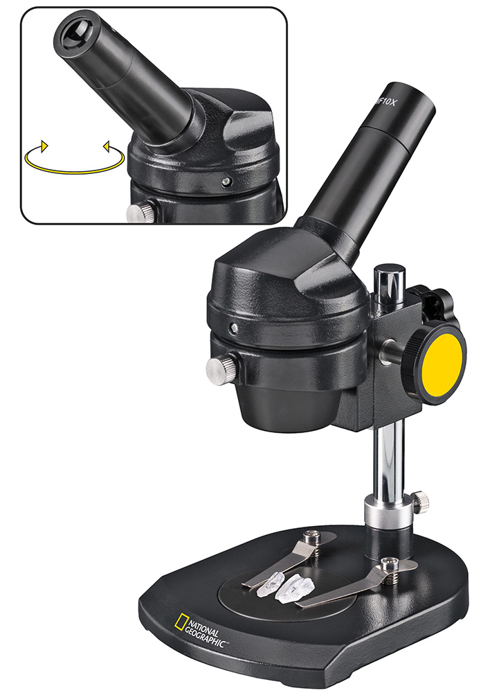 В микроскопе используется монокулярная насадка, которую можно поворачивать на 360°. Окулярная трубка наклонена под углом в 45°. Микроскоп дает одно увеличение в 20 крат, а наблюдения ведутся в естественном освещении. Оптический прибор можно ставить вблизи окна или использовать на улице – так образцы будут освещены наиболее равномерно и ярко.