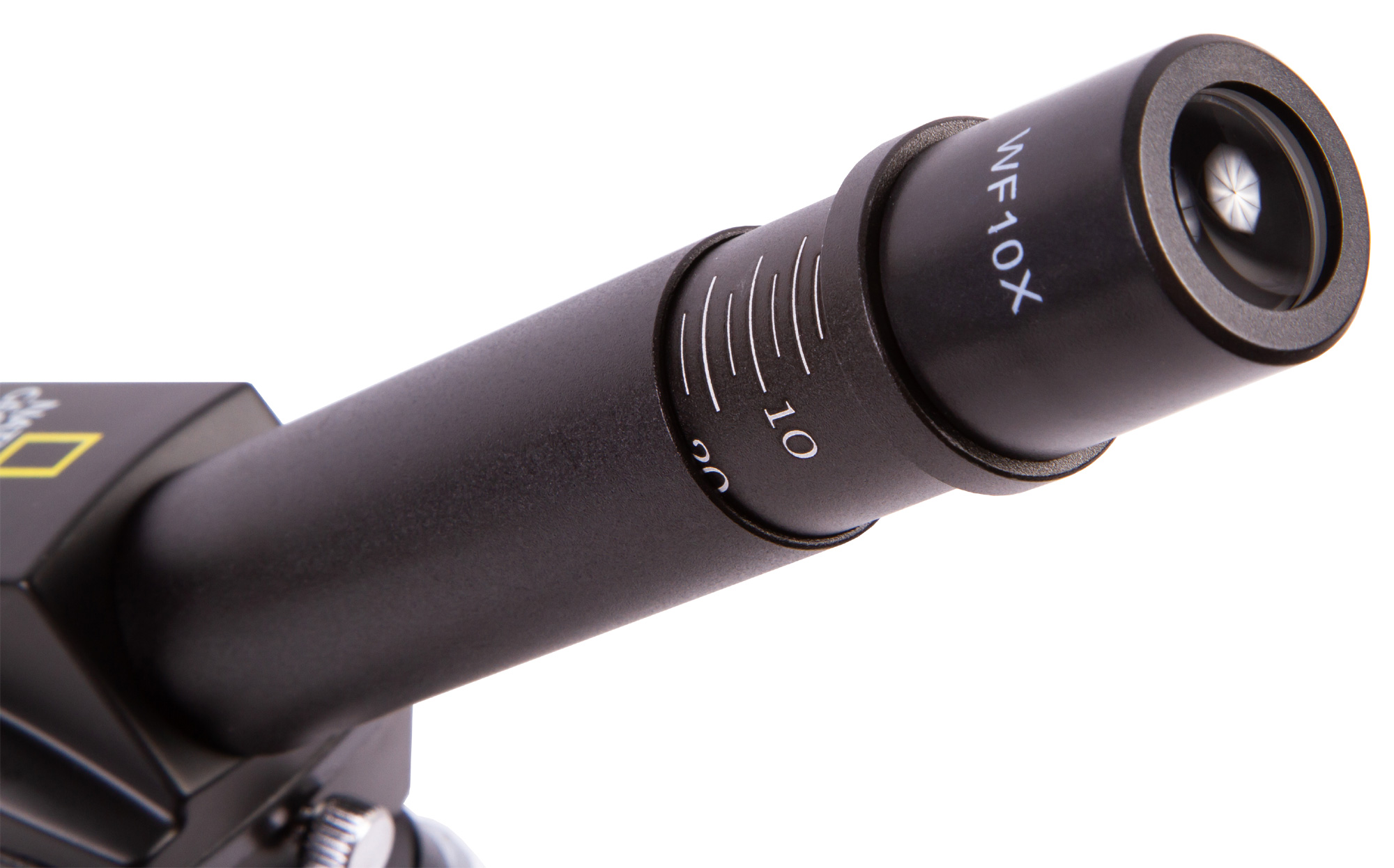 В микроскопе установлена монокулярная насадка со сменными окулярами. Один окуляр дает 10-кратное увеличение, второй – 16-кратное. Объективов три, они установлены в револьверное устройство и обеспечивают приближение в 4, 10 и 40 раз. Также есть 2-кратная линза Барлоу, которая расширяет количество доступных увеличений. Общий диапазон кратности микроскопа составляет от 40 до 1280 крат.