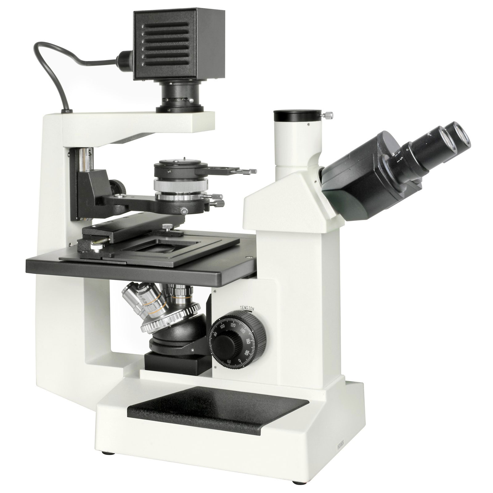 Тринокулярная насадка позволяет устанавливать цифровую камеру (нет в комплекте), чтобы вести фото- и видеосъемку исследований. Небольшой наклон окулярной насадки удобен при длительных наблюдениях, так как мышцы шеи устают значительно меньше. Широкопольные окуляры обеспечивают хороший обзор и позволяют работать с протяженными образцами. Револьверное устройство вмещает четыре объектива, один из объективов предназначен для ведения наблюдений фазово-контрастным методом, три других – это объективы для классических наблюдений. Общее увеличение оптики составляет от 100 до 400 крат.