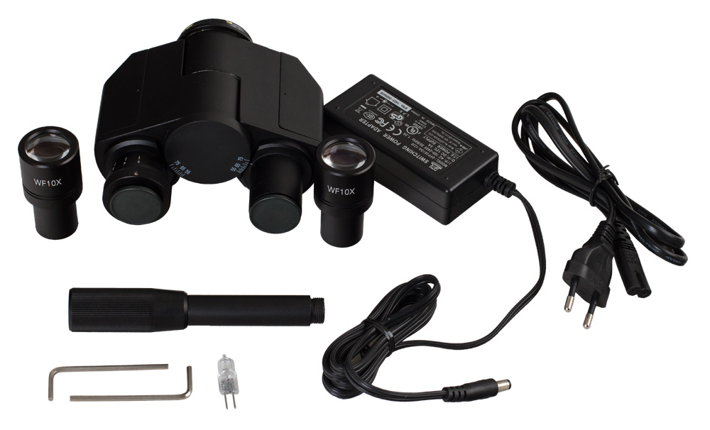 В микроскопе установлена ахроматическая оптика, снижающая оптические искажения, поэтому даже на максимальном увеличении передаваемая картинка отличается четкостью и ясностью. Револьверное устройство рассчитано на установку пяти объективов одновременно, в комплект поставки включены объективы разной кратности с разным рабочим расстоянием. Окулярная насадка имеет небольшой наклон, поэтому длительные наблюдения не вызывают чрезмерной усталости. При необходимости в отдельную окулярную трубку можно установить цифровую камеру для фото- и видеосъемки образцов. Камера приобретается отдельно.