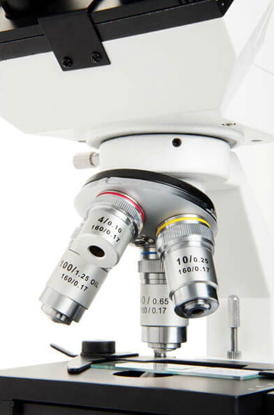 Микроскоп комплектуется двумя парами широкоформатных окуляров (10x и 20x). В комплект поставки входят также 4 объектива-ахромата – 4х, 10х, 40х и 100х (для масляной иммерсии). С помощью штатного набора окуляров и объективов можно получить увеличения от 40 до 2000 крат. Оптика микроскопа сделана из высококачественного стекла.