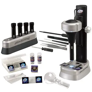 Микроскоп дает несколько фиксированных увеличений: 100, 300, 450, 600 и 900 крат. Прибор прост в использовании: для начала работы нужно только подключить его к компьютеру через USB-кабель (есть в комплекте) и зафиксировать микропрепарат на предметном столике. Камера, установленная в микроскопе, будет передавать изображение с объектива на монитор компьютера в режиме реального времени. Для работы микроскопа требуются две батарейки типа АА (приобретаются отдельно).
