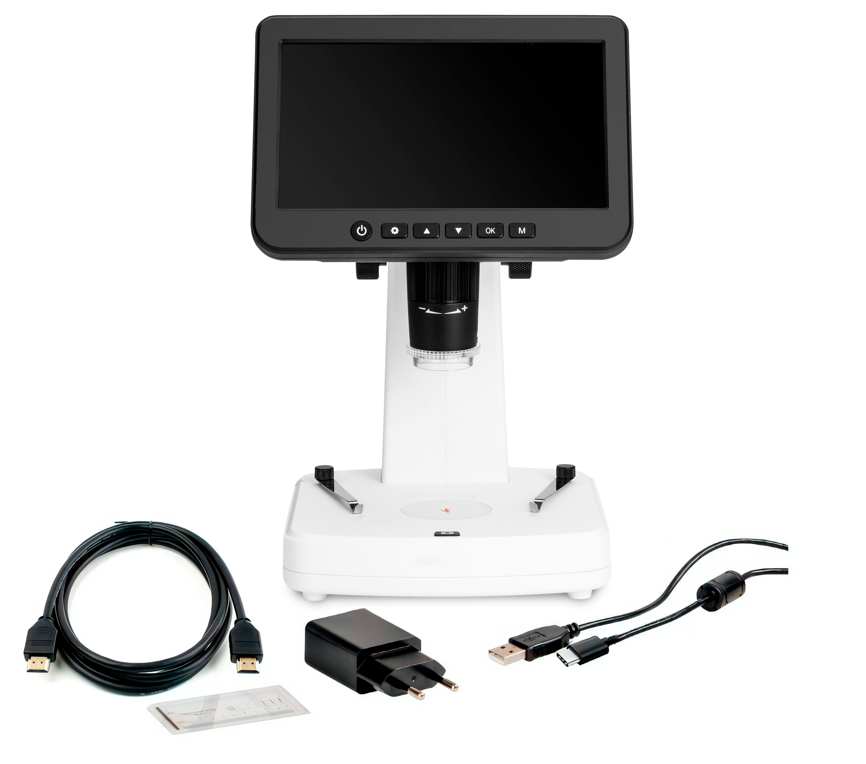 За формирование картинки отвечает цифровая камера 4 Мпикс с чувствительным CMOS-сенсором. Изображение, наблюдаемое пользователем, отличается яркими цветами, четкостью и информативностью; оно выводится на IPS-дисплей с диагональю 7 дюймов и разрешением 1024х600 пикс, на котором его удобно изучать, не меняя позицию тела и не напрягая глаза и шею, как в случае с классическими микроскопами. Камеру, отвечающую за «зрение» микроскопа, можно использовать для записи фото и видео, при этом пользователю предоставляется широкий выбор разрешений: так, фотографии можно снимать в качестве 3 или 2 Мпикс, с интерполяцией – в качестве 16, 12, 10, 8 или 5 Мпикс, а видео – в 1440р и с комфортной кадровой частотой 30 FPS. Levenhuk DTX 800 LCD поддерживает карты памяти microSD объемом до 128 ГБ – их потребуется использовать для сохранения отснятых материалов.