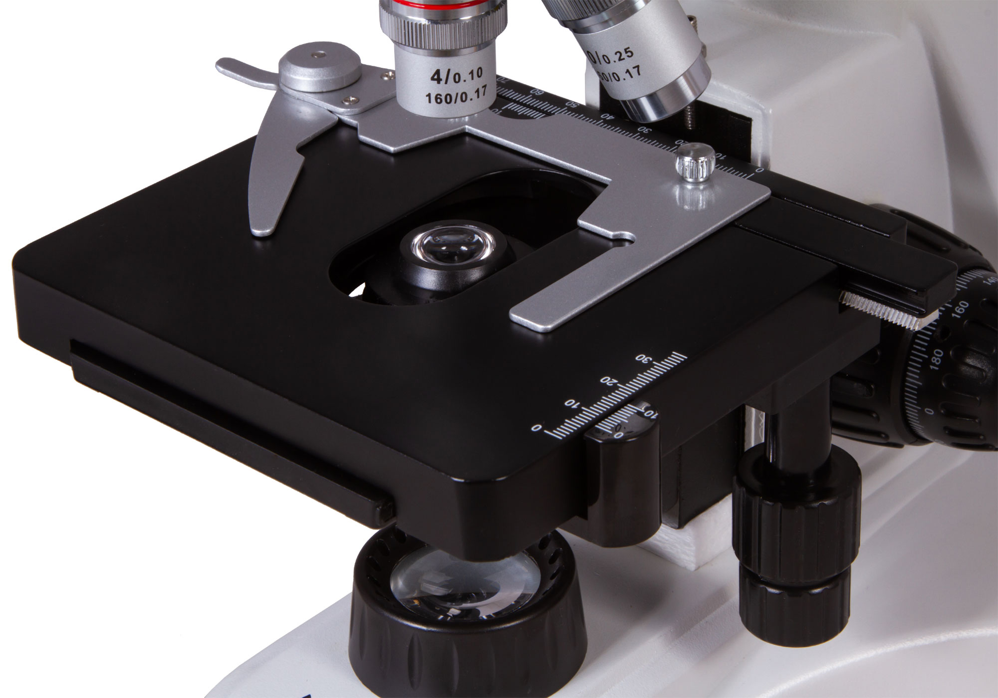 Предметный столик можно перемещать по двум направлениям, кроме того, он снабжен препаратоводителем. Под ним находится осветительная система микроскопа. Она состоит из яркого 5-ваттного светодиода и конденсора Аббе с ирисовой диафрагмой и держателем фильтра (три светофильтра входят в комплект поставки). Подсветка работает от сети переменного тока. Яркость подсветки можно регулировать. Для настройки резкости используются грубая и точная фокусировки.