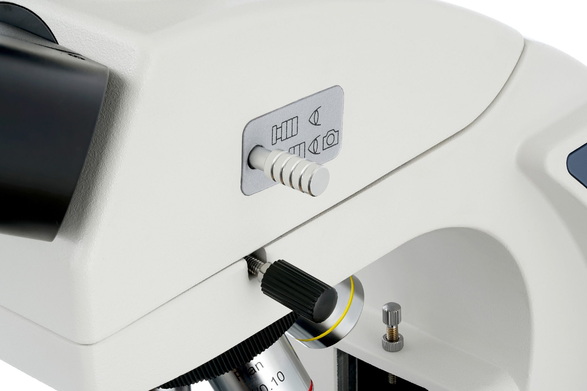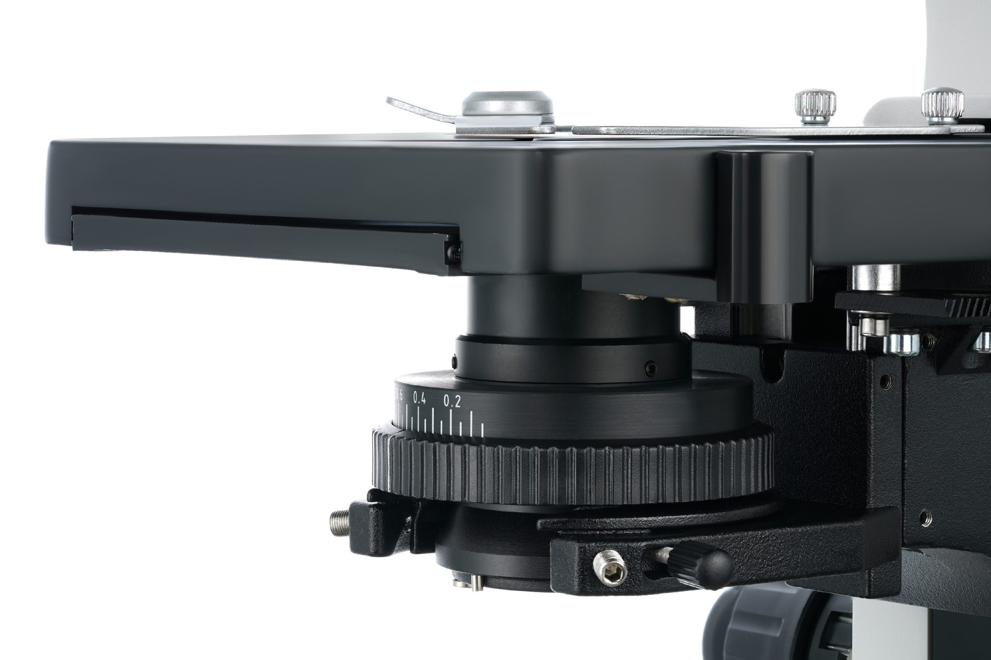 Под объектив образцы помещаются при помощи препаратоводителя. Предметный столик можно передвигать по двум направлениям. Для настройки резкости используются грубая и точная фокусировки. Яркая светодиодная подсветка расположена внизу. В систему освещения входит и конденсор Аббе с ирисовой диафрагмой и держателем фильтра. Доступна настройка освещения по Келеру.