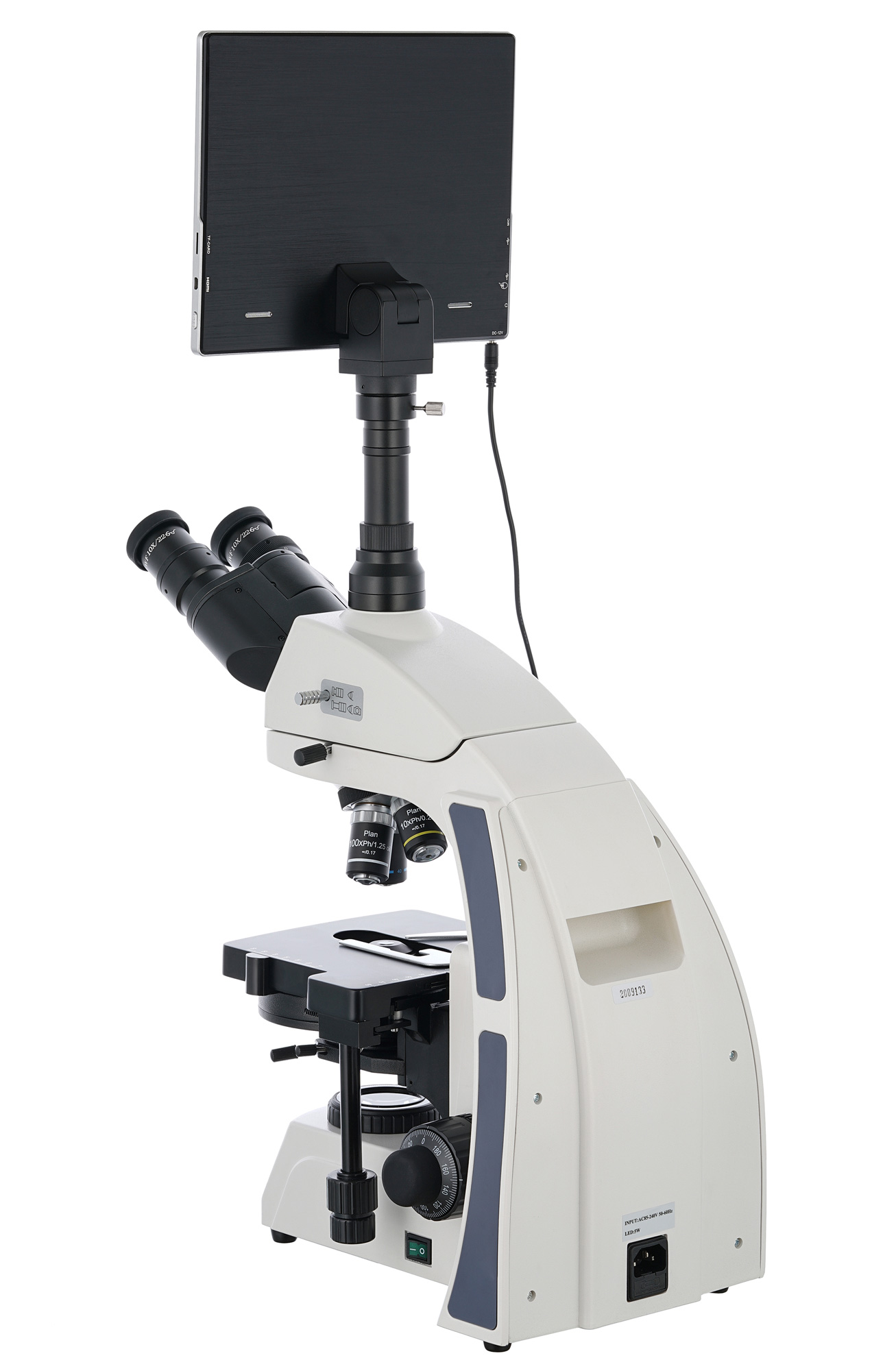 Тринокулярная насадка разделена на бинокулярный визуальный блок и отдельную окулярную трубку для установки цифровой камеры. Камера включена в комплект поставки и позволяет делать фото и записывать видео в высоком качестве. Картинку с объектива микроскопа можно выводить на встроенный ЖК-экран камеры с сенсорным управлением, а также на подключенный внешний монитор или телевизор. Установка программ или драйверов не требуется – камера готова к работе сразу после подключения к сети.