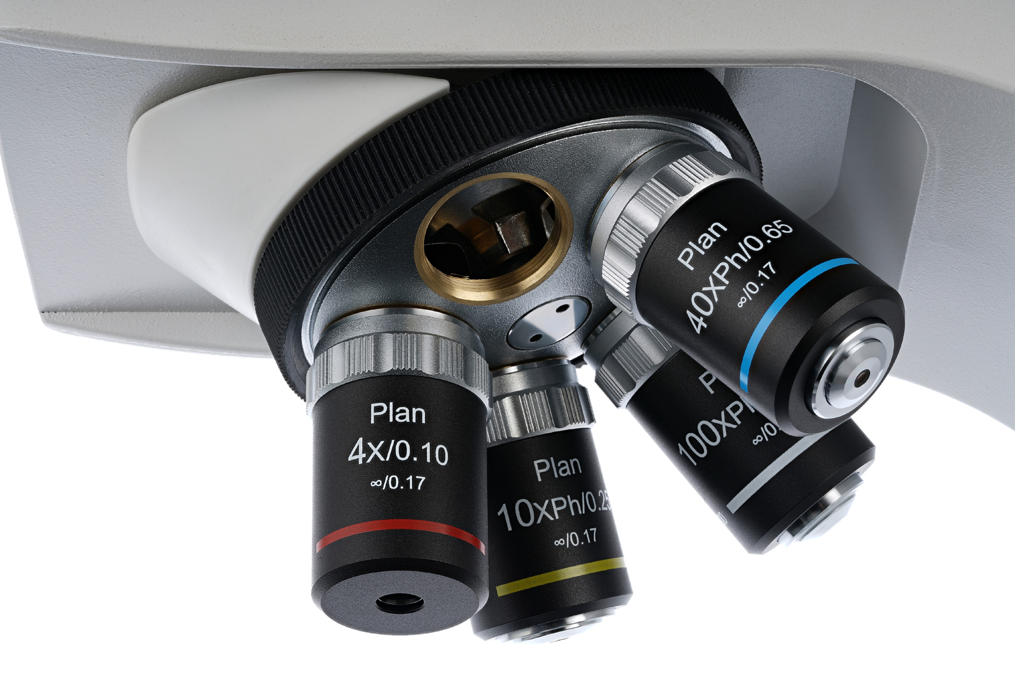 - Объективы фазовые планахроматические, скорректированные на бесконечность: 4x, 10x, 40xs, 100xs (масляный) с антигрибковым покрытием