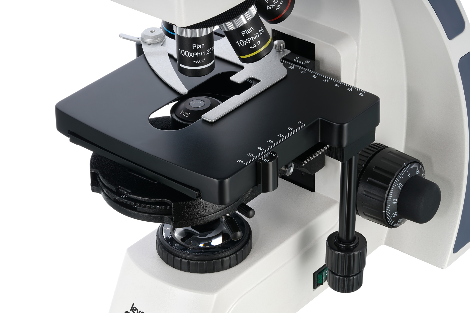 У двухкоординатного предметного столика есть препаратоводитель. Под столиком находится фазовый конденсор (темное поле можно использовать только при «сухом» методе наблюдений), еще ниже – светодиодная подсветка с регулировкой яркости. Для работы подсветки требуется подключение к сети переменного тока.