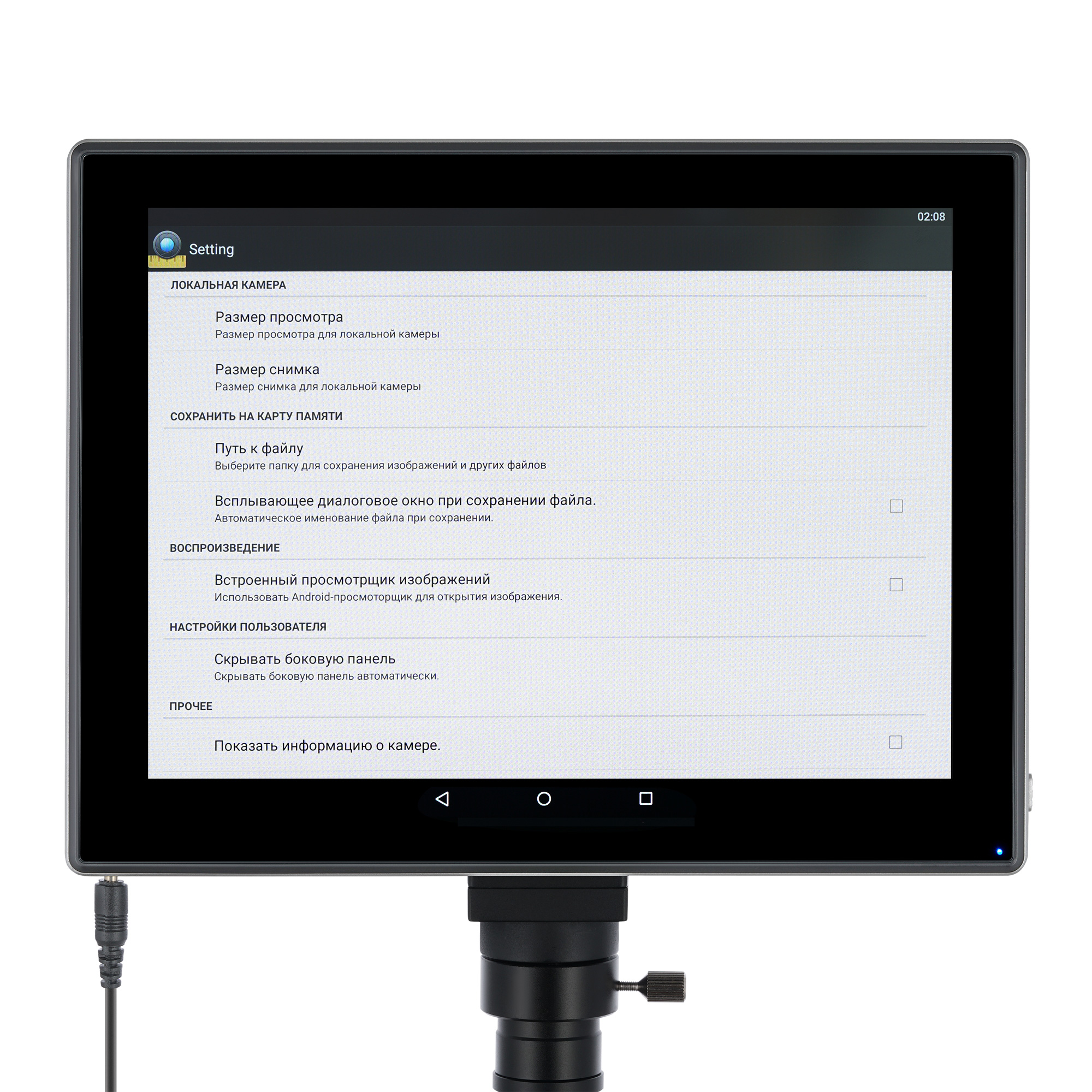 Камера делает работу в лаборатории более легкой и удобной, так как позволяет снизить нагрузку на зрение – нет необходимости непрерывно смотреть в окуляры, поскольку картинка показывается на ЖК-экране в реальном времени. Кроме того, к камере можно подключать внешние накопители данных, наушники, компьютерную мышь и другие аксессуары. С помощью установленного ПО можно корректировать размер, яркость, контрастность, гамму, резкость и насыщенность изображения, менять время выдержки и баланс белого, проводить калибровку камеры с объективами, измерять образцы или отдельные структуры (доступно несколько единиц измерения). Кроме того, программа позволяет проводить анализ частиц. Сама тринокулярная насадка вращается вокруг своей оси на 360°, а визуальная часть имеет удобный наклон в 30°.