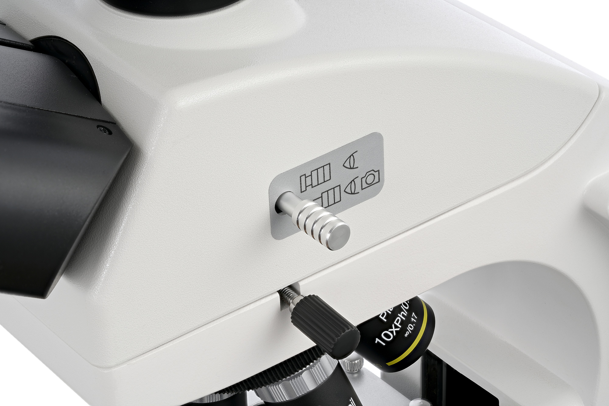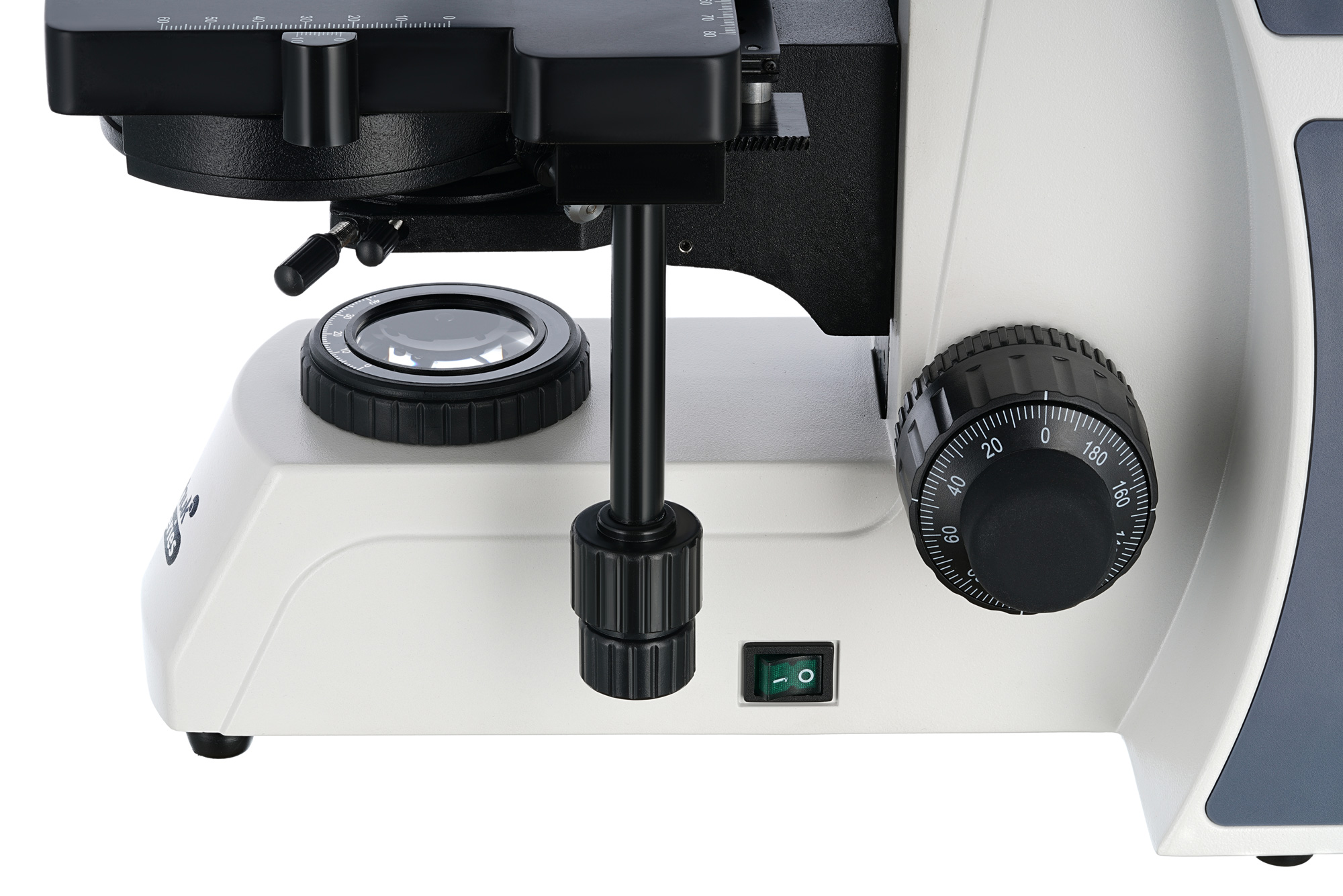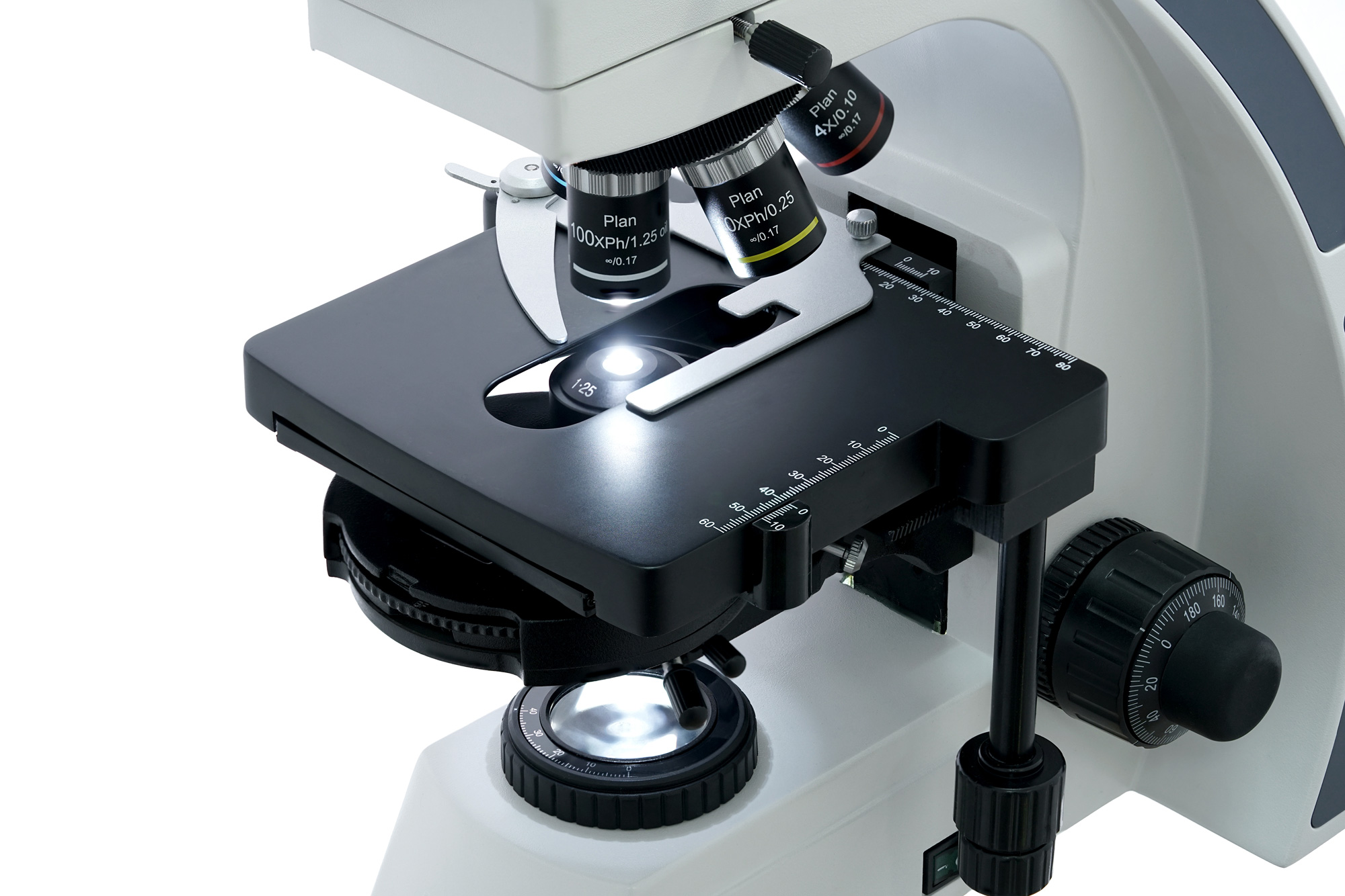 У двухкоординатного предметного столика есть препаратоводитель, который позволяет быстро и точно размещать образцы под объективом. Доступны грубая и точная фокусировки. Есть возможность настройки освещения по методу Келера. Светодиодная подсветка расположена внизу и имеет регулировку яркости. Фазовый конденсор можно применять для темнопольных исследований «сухим» методом.