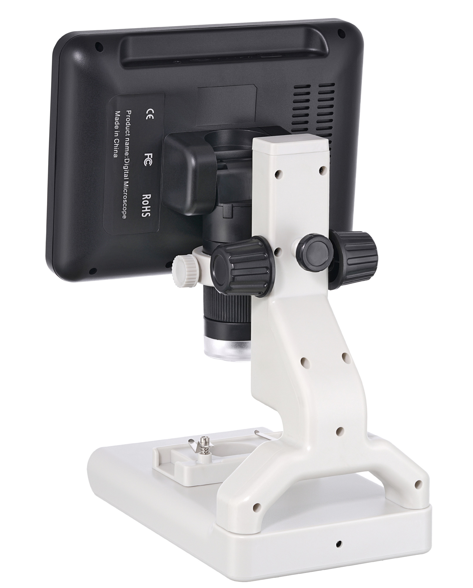 Увеличение микроскопа составляет от 10 до 200 крат, оптическая его часть – от 10 до 50 крат. Картинка с объектива выводится на встроенный цветной экран с диагональю 7 дюймов (около 18 см). Изображение четкое и хорошо читаемое. Под экраном расположены кнопки управления, также они продублированы на дистанционный пульт. С пульта можно регулировать яркость подсветки, выбирать наиболее подходящее для наблюдений увеличение, делать фото, записывать видео и многое другое.