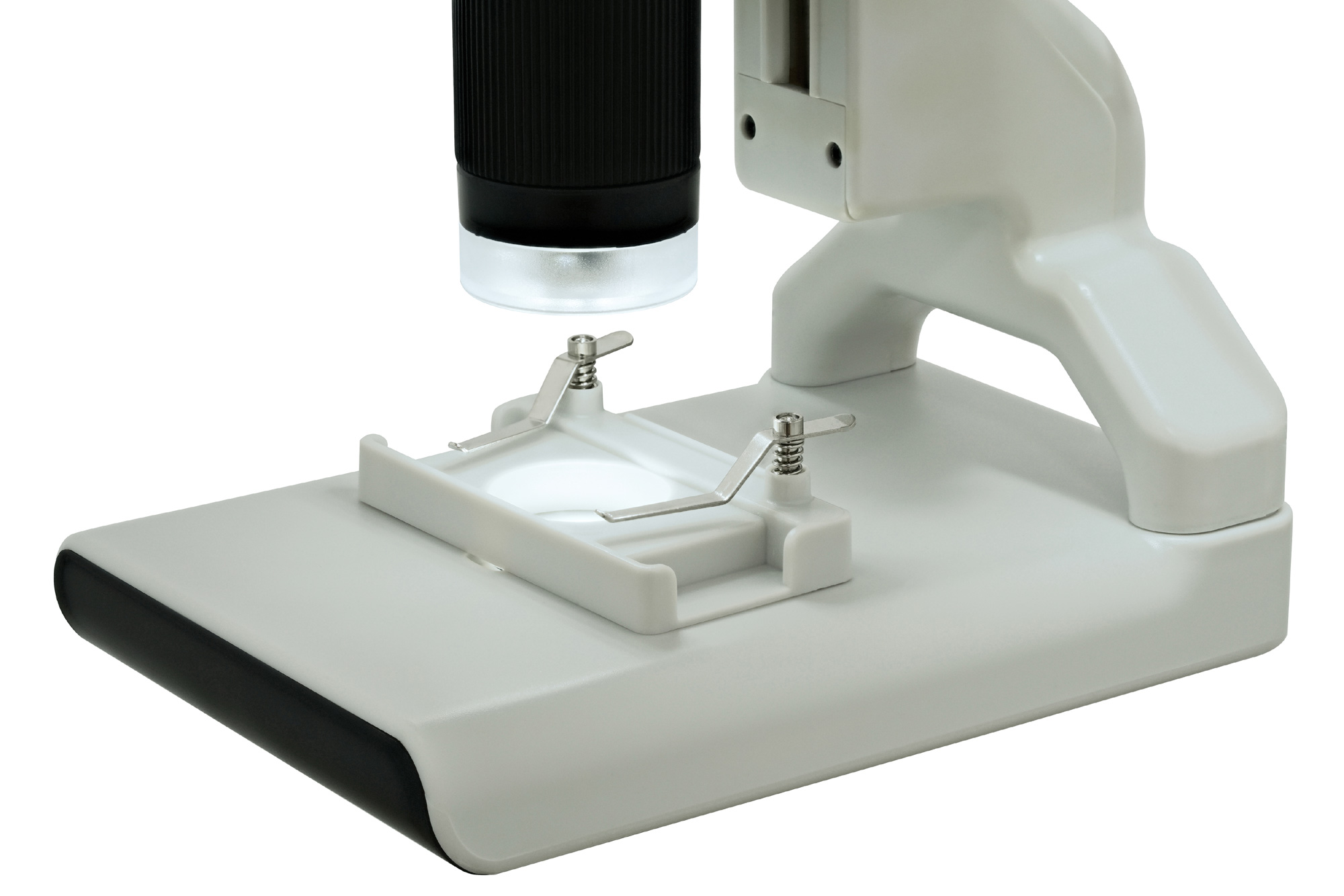 Предметный столик освещается с двух сторон – сверху и снизу. Это позволяет исследовать образцы любой степени прозрачности. Для фиксирования микропрепаратов используются металлические зажимы. Небольшой набор с готовыми образцами включен в комплект поставки.