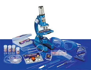 Микроскоп имеет большой диапазон увеличений: от 100 до 1200 крат. Револьверное устройство снабжено тремя объективами. Поворачивая револьвер, можно добиться необходимого увеличения. Предметный столик имеет лапки-держатели для фиксации микропрепарата. Под ним расположен блок осветителя с двумя типами подсветки: с одной стороны это зеркало-отражатель, а с другой – лампочка. Если в помещении достаточно яркое освещение, можно использовать зеркало. Достаточно наклонить его так, чтобы луч света падал на микропрепарат. Лампочка работает от двух батареек типа АА (в комплект не входят). Микроскоп комплектуется большим количеством аксессуаров, с которыми можно приступить к наблюдениям сразу после извлечения прибора из коробки.