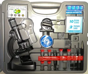 - В комплекте набор для опытов (микропрепараты, инструменты, посуда), лупа 3х/6х и кейс