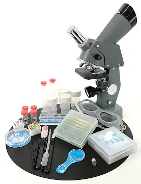 Исследовать микрообразцы можно на одном из трех доступных увеличений: 100х, 300х или 1000х. Кратность выбирается путем поворота револьверного устройства. Предметный столик снабжен зажимами, под ним находится поворотный блок подсветки. С одной стороны блока расположено зеркало, с другой – лампочка. Так как все наблюдения проводятся в проходящем свете, образцы для исследований должны быть прозрачными. Их можно подготовить самостоятельно или приобрести в виде набора готовых микропрепаратов. Несколько образцов есть в комплекте.