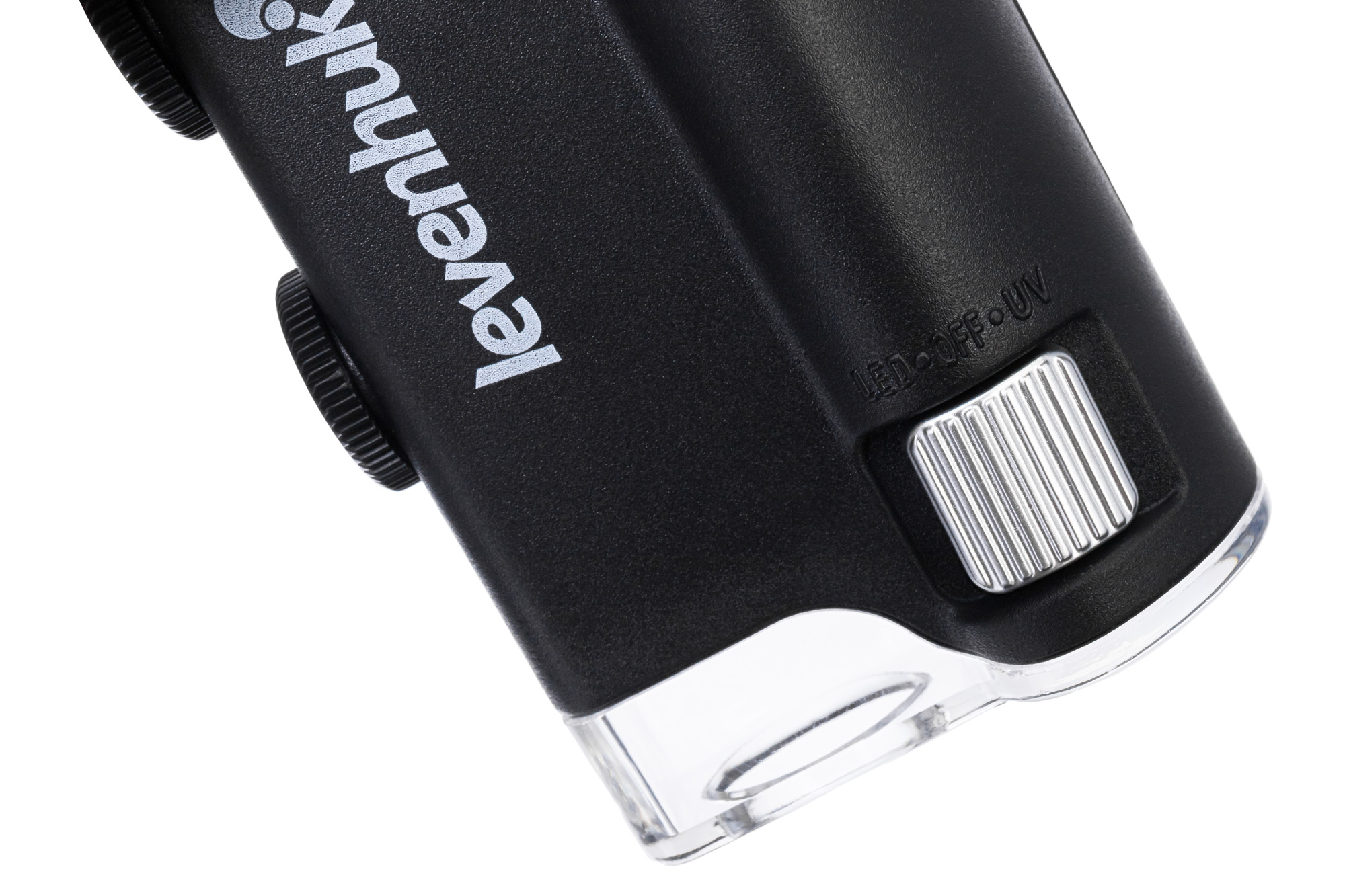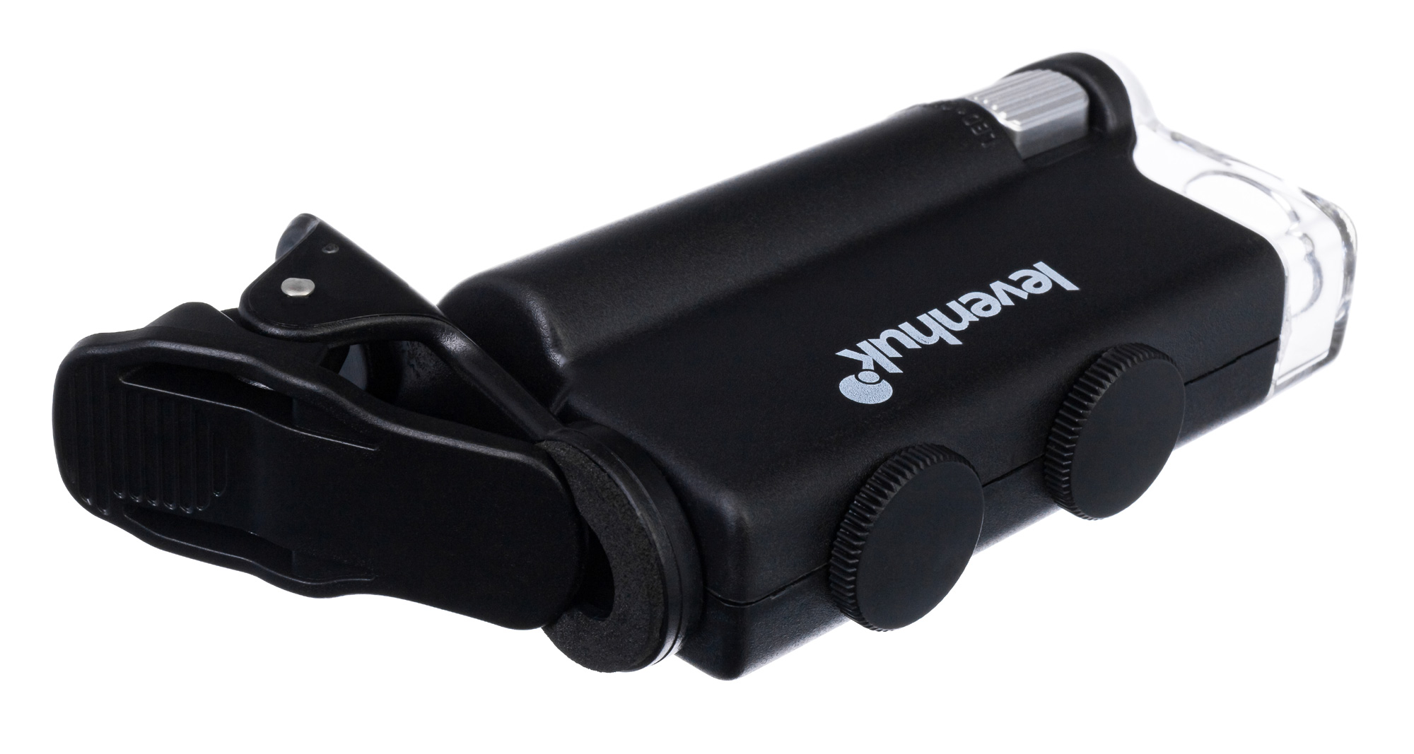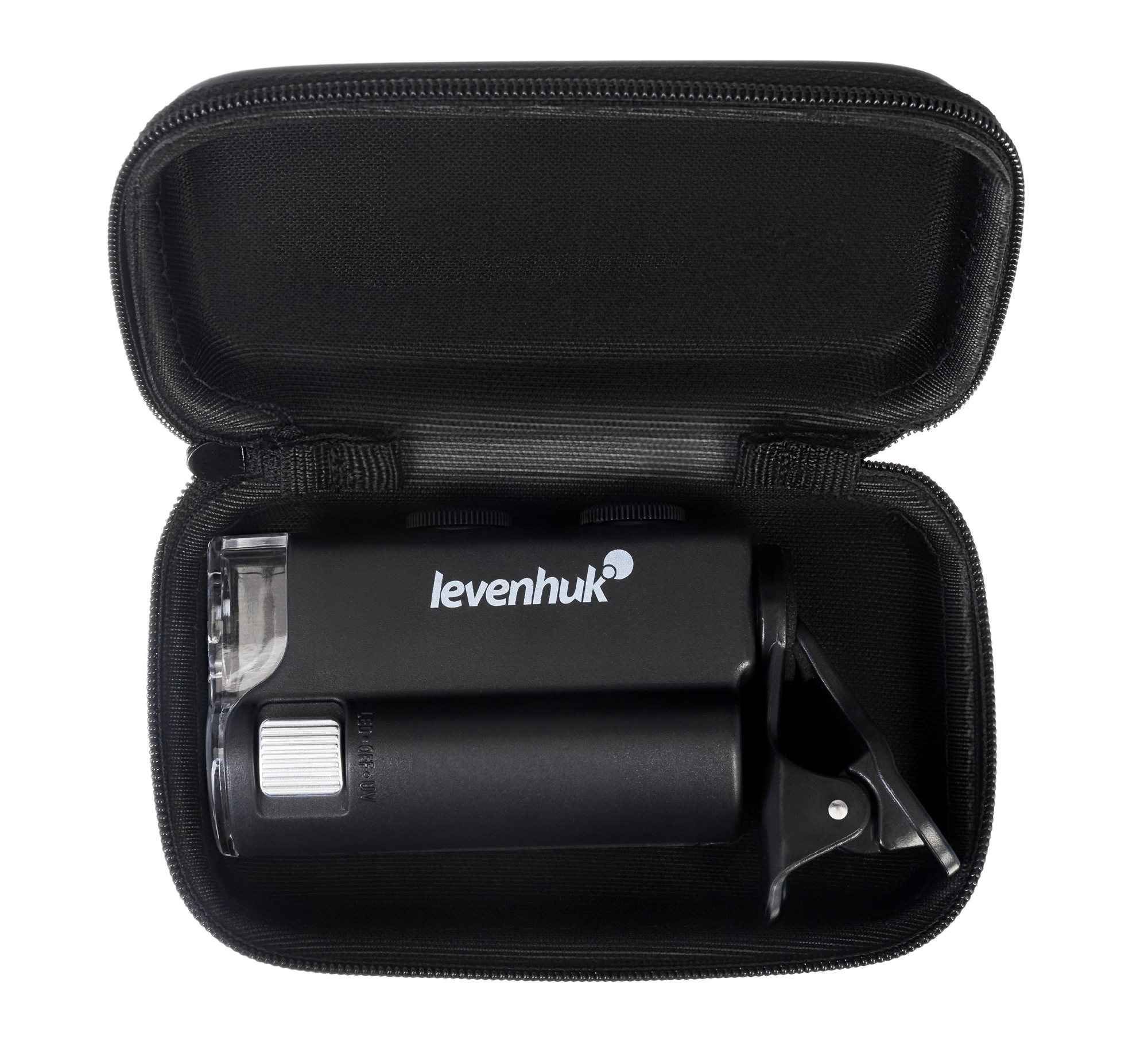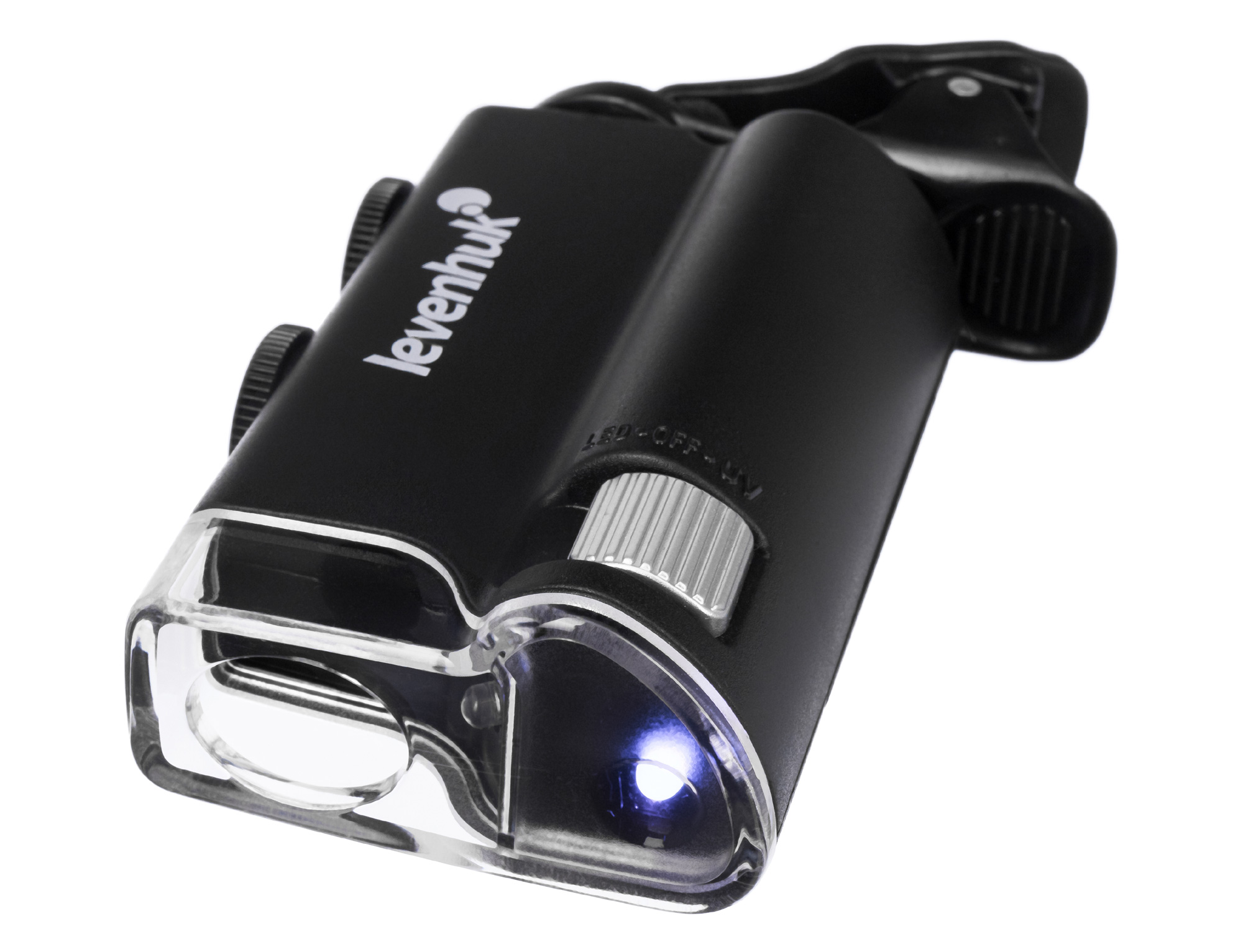 Микроскоп можно фиксировать на мобильном телефоне при помощи комплектного зажима. Если расположить его прямо напротив камеры смартфона, ее получится использовать для фотографирования и видеозаписи. Картинка с объектива микроскопа при этом будет выводиться прямо на экран мобильного устройства. Так как кроме ультрафиолетовой подсветки в Levenhuk Zeno Cash ZC10 есть и светодиодная, он может брать на себя функцию мощной лупы с плавно изменяемым увеличением.