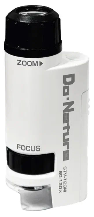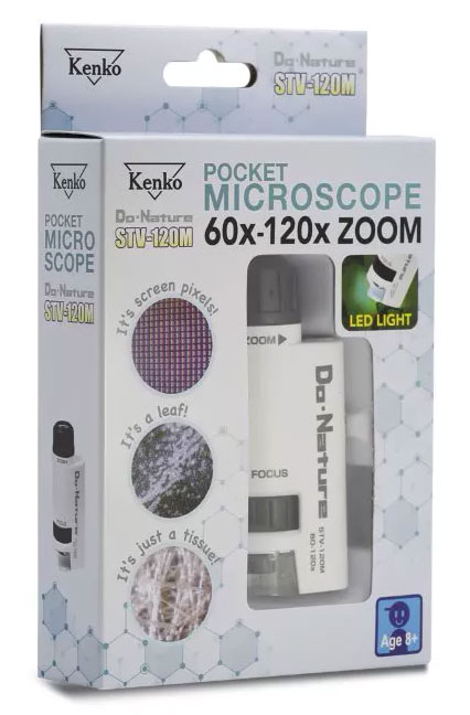 Портативный микроскоп Kenko Do-Nature STV-120M – это инструмент для полевых и домашних исследований, которым могут пользоваться даже дети начиная с восьми лет. Микроскоп обеспечивает увеличение 60 или 120 крат, поэтому с его помощью можно изучать как мелкие изображения и предметы, так и капли воды, структуру листьев растений или кожуры фруктов.