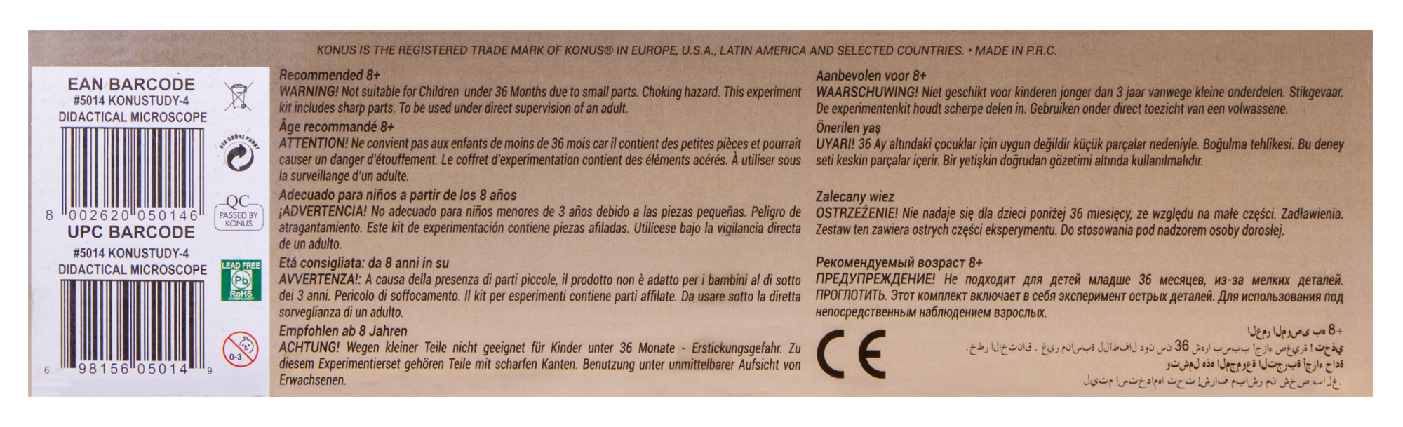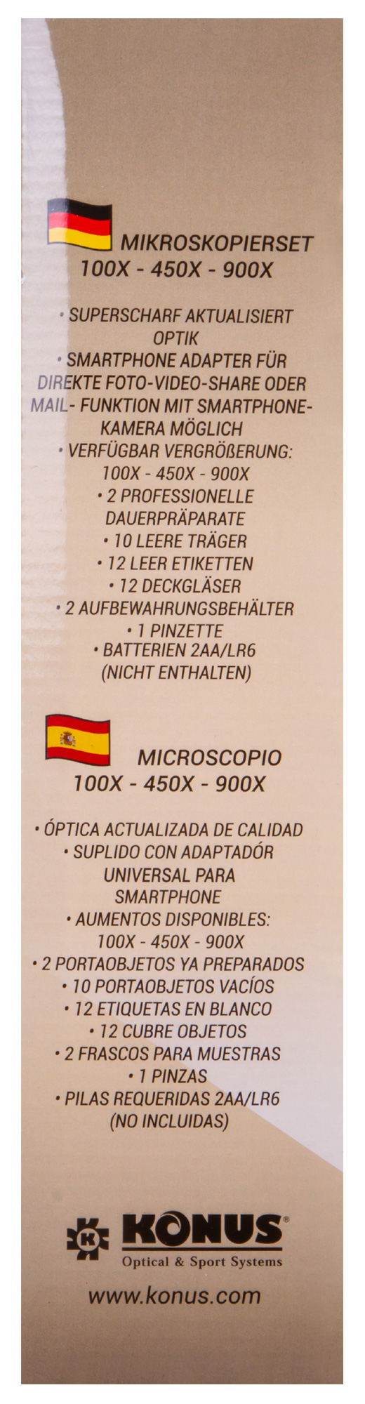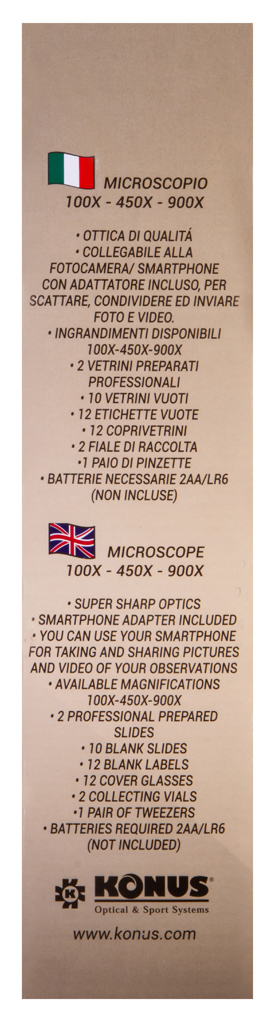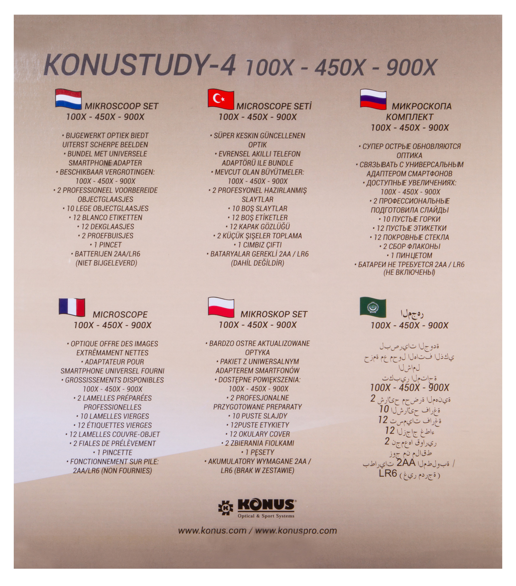 Детский микроскоп Konus Konustudy-4 900x – исследовательский инструмент начального уровня, который познакомит ребенка с основами биологии и позволит заглянуть в увлекательный микромир. Кроме микроскопа, в комплект поставки включены набор для опытов и аксессуары для работы с микропрепаратами. Также здесь есть адаптер для смартфона, с помощью которого на микроскопе можно закрепить мобильное устройство и использовать его камеру для фото- и видеосъемки.