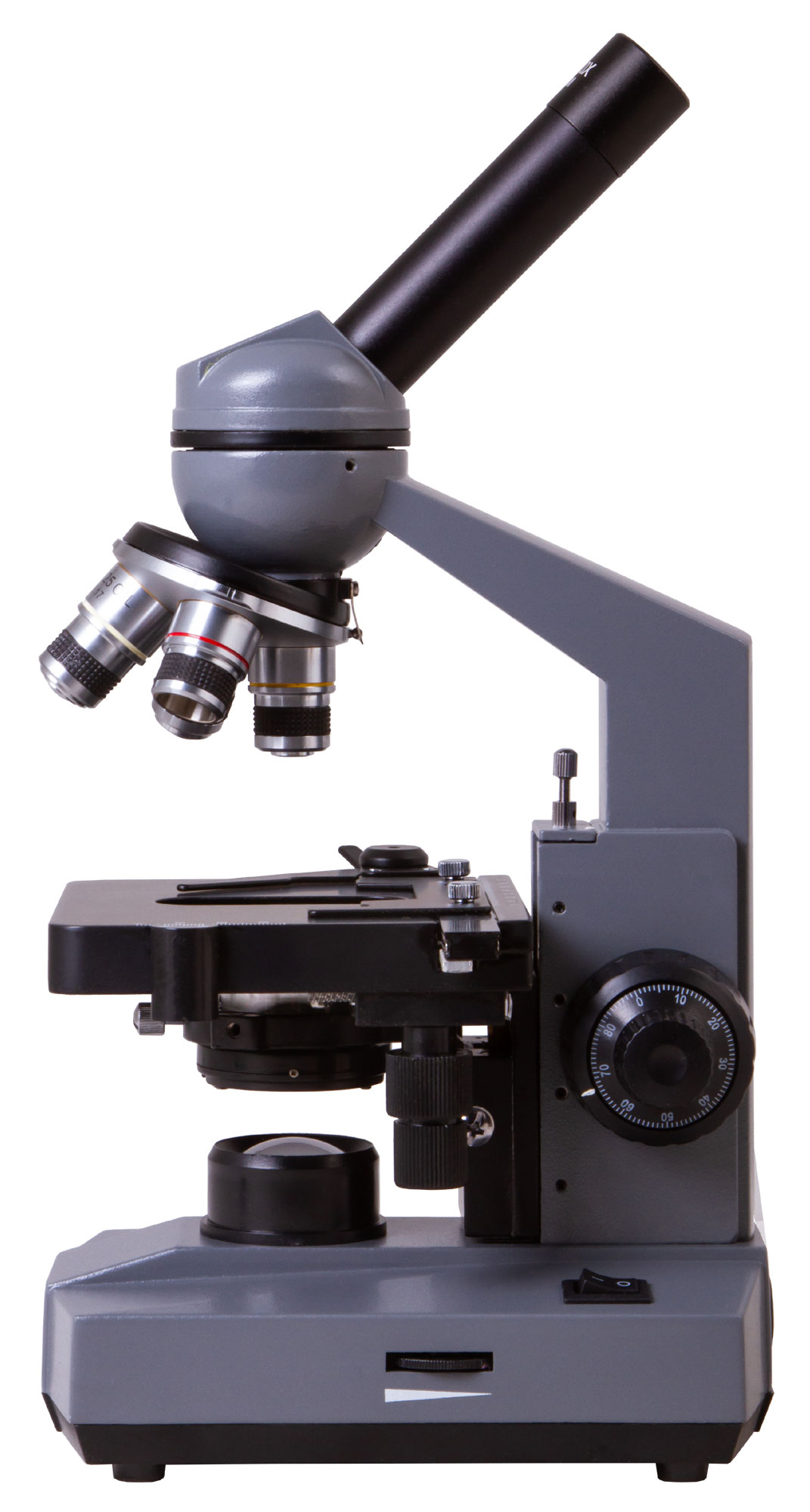 Для освещения образцов в микроскопе используется нижняя светодиодная подсветка с регулировкой яркости. Световой пучок проходит через конденсор Аббе, его интенсивность можно регулировать ирисовой диафрагмой. В комплекте поставки есть светофильтры, которые помогают делать наблюдаемое изображение более контрастным и четким. Подсветка может работать от сети переменного тока или от перезаряжаемых батареек (в комплекте). Одного заряда аккумуляторов хватает примерно на 10 часов непрерывной работы. Благодаря этому микроскоп Levenhuk 320 PLUS можно использовать вне дома: в экспедициях или на семинарах.