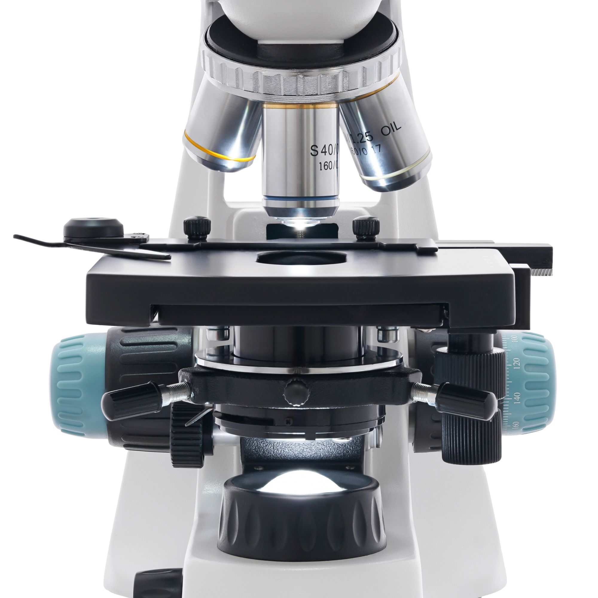 Предметный столик снабжен препаратоводителем, под столиком находится конденсор Аббе с ирисовой диафрагмой и держателем фильтра, еще ниже расположен блок подсветки – светодиод с коллектором. Яркость подсветки можно регулировать. Так как для питания можно использовать перезаряжаемые батарейки (в комплекте), микроскоп удобно использовать вдали от электросети.
