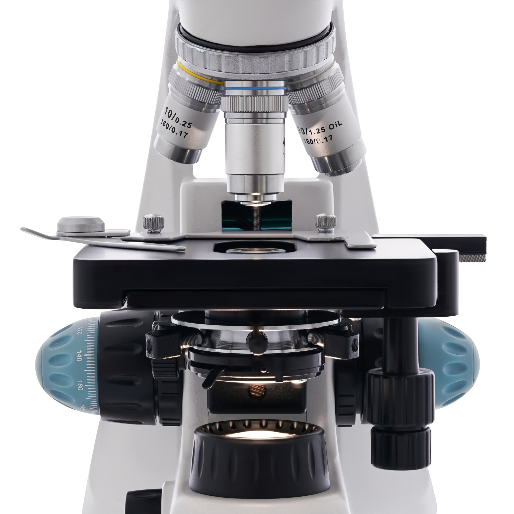 На предметный столик установлен препаратоводитель – он помогает быстро поместить образец точно под объективом. Под предметным столиком расположен светлопольный конденсор Аббе, высоту которого можно регулировать. Есть ирисовая диафрагма и держатель фильтра. Система освещения состоит из галогенной лампочки с коллектором, она мощная и создает равномерное и яркое освещение рабочей области. Яркость подсветки можно регулировать. Для питания используется сеть переменного тока.