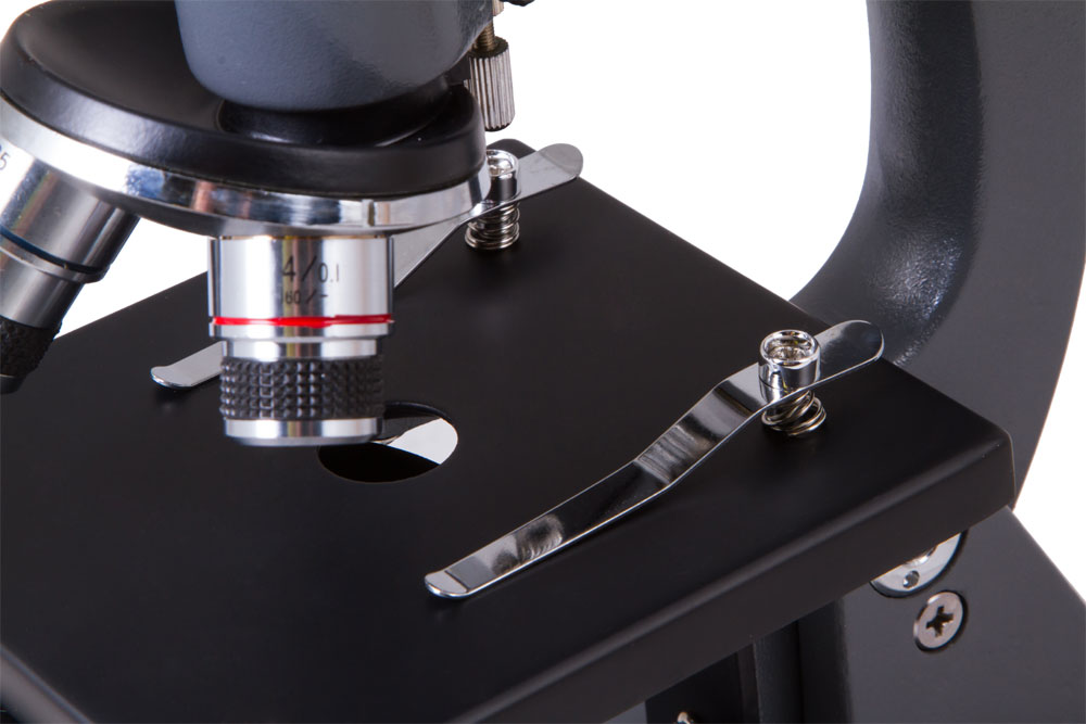 Трехгнездное револьверное устройство обеспечивает быструю смену объективов прямо во время наблюдений. В окулярную трубку можно устанавливать разные окуляры – два уже включены в комплект поставки. Предметный столик снабжен простыми препаратодержателями, предназначенными для фиксирования готовых микропрепаратов. Прямо над ним расположены ручки точной и грубой фокусировки, позволяющие плавно настраивать резкость. В качестве осветителя используется небольшое зеркало. Диск с диафрагмами позволяет регулировать интенсивность освещения.