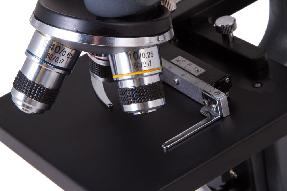 Диапазон увеличений микроскопа составляет от 40 до 800 крат. Этого вполне хватает для проведения школьных биологических опытов, изучения жизни простейших одноклеточных организмов, исследования мелких структур готовых микропрепаратов. Револьверное устройство вмещает три объектива, а в окулярную трубку можно устанавливать окуляры разной кратности. Настраивать резкость можно при помощи ручек грубой и точной фокусировки. А препаратоводитель помогает точно расположить образец прямо под объективом.