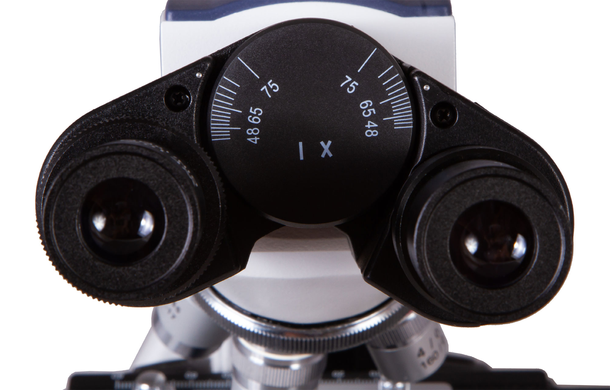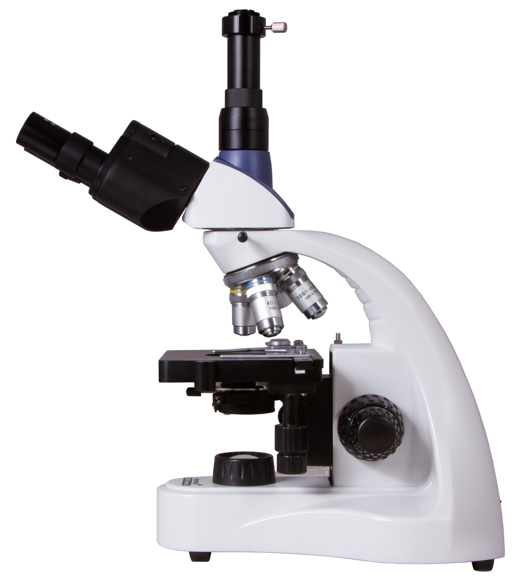 Тринокулярная насадка представляет собой бинокулярный визуальный узел и отдельную трубку для установки цифровой камеры (камера в комплект не входит). Визуальная часть отклонена на угол в 30°, что делает длительные наблюдения более комфортными. Насадку можно вращать вокруг оси на 360°. На микроскоп установлены четыре ахроматических объектива с разным увеличением, 40-кратный и 100-кратный объективы снабжены защитными пружинящими оправами. Кроме того, 100-кратный объектив может использоваться для масляной иммерсии (флакон с маслом входит в комплект поставки). Широкопольные окуляры имеют диоптрийную коррекцию и обеспечивают хороший обзор. Все комплектные оптические элементы защищены антигрибковым покрытием.