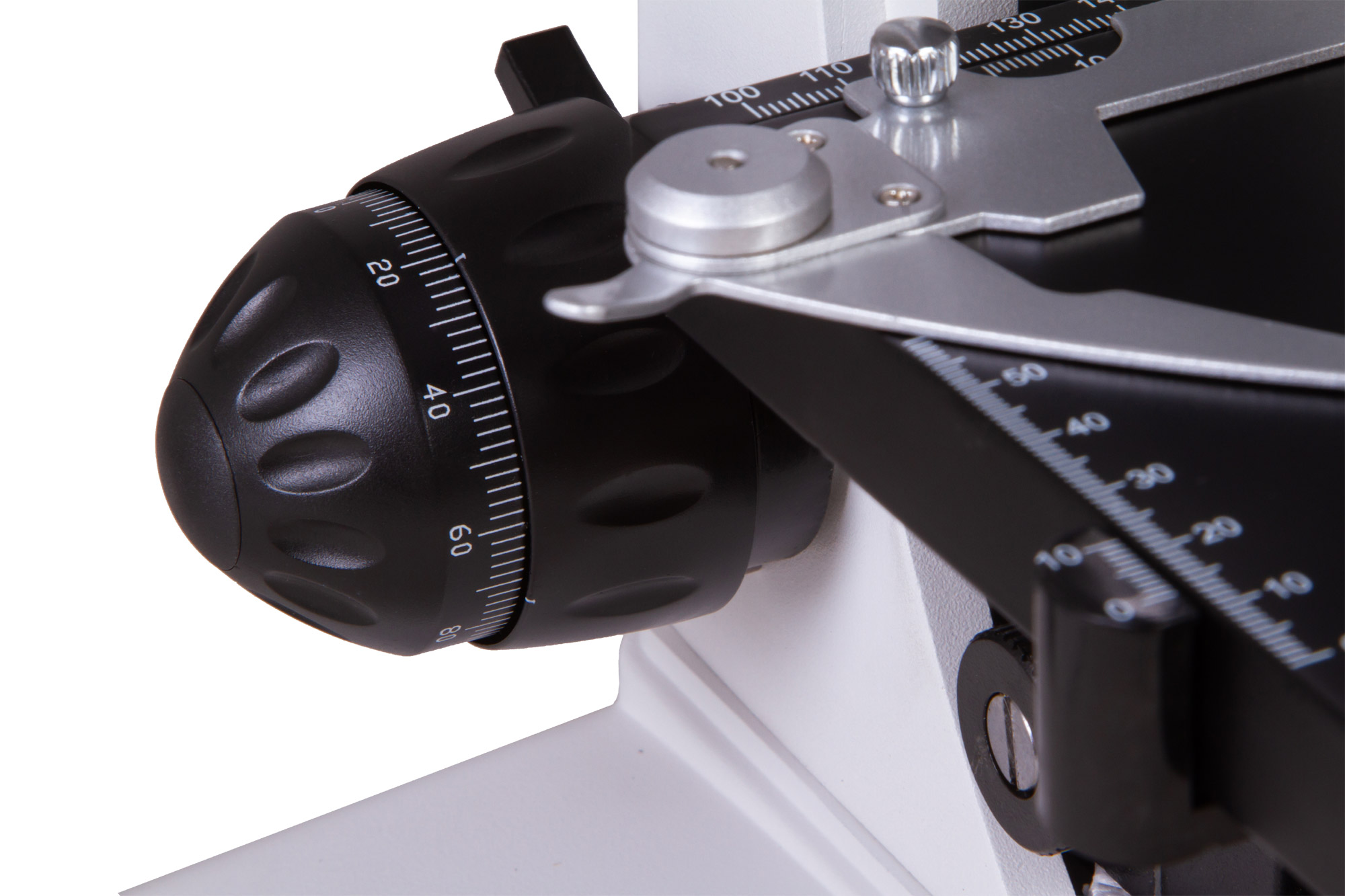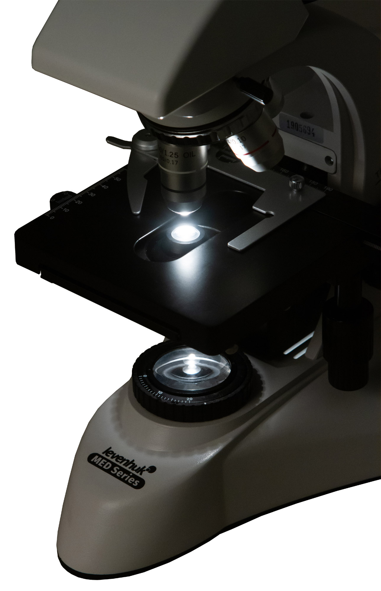 Микропрепараты фиксируются на двуслойном предметном столике, который можно перемещать по двум направлениям. Он снабжен препаратоводителем, который помогает максимально точно установить образец под объективом микроскопа. Прямо под столиком находится конденсор Аббе с ирисовой диафрагмой и держателем фильтра. Еще ниже – галогенный осветитель мощностью 20 Вт. Подсветка работает от сети переменного тока, ее яркость можно регулировать. Кроме того, микроскоп позволяет настраивать освещение по Келеру.