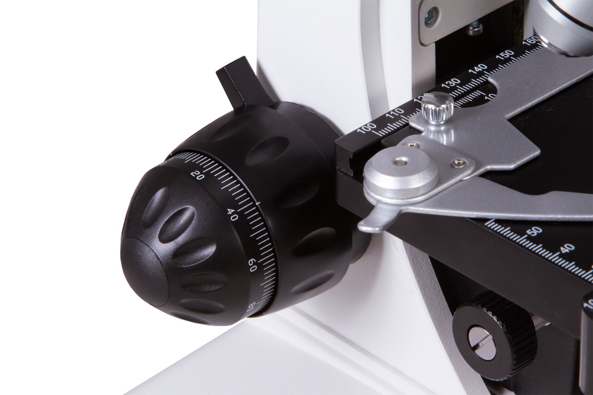 На двуслойном предметном столике есть препаратоводитель – с его помощью можно установить микропрепарат под объективом максимально точно. За настройку резкости отвечают ручки фокусировки – грубой и точной. Благодаря мягкому и плавному ходу, а также малому шагу изменений, легко получить идеально четкое изображение. Конденсор Аббе, расположенный под предметным столиком, снабжен ирисовой диафрагмой и держателем фильтра. Он используется для наблюдений в светлом поле. Конденсор темного поля тоже включен в комплект поставки, его можно применять и для масляной иммерсии.