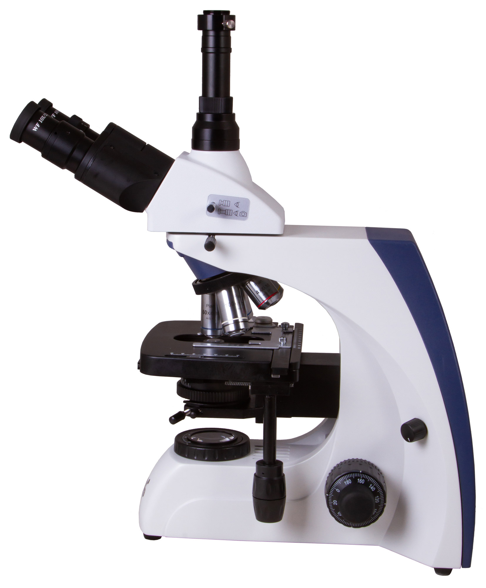 Тринокулярная насадка микроскопа представляет собой визуальную часть, которая отклонена на 30-градусный угол, и отдельную окулярную трубку для установки цифровой камеры (камера в комплект поставки не входит). Насадку можно поворачивать вокруг своей оси, благодаря чему удобно вести групповые исследования. Есть делитель светового потока.
