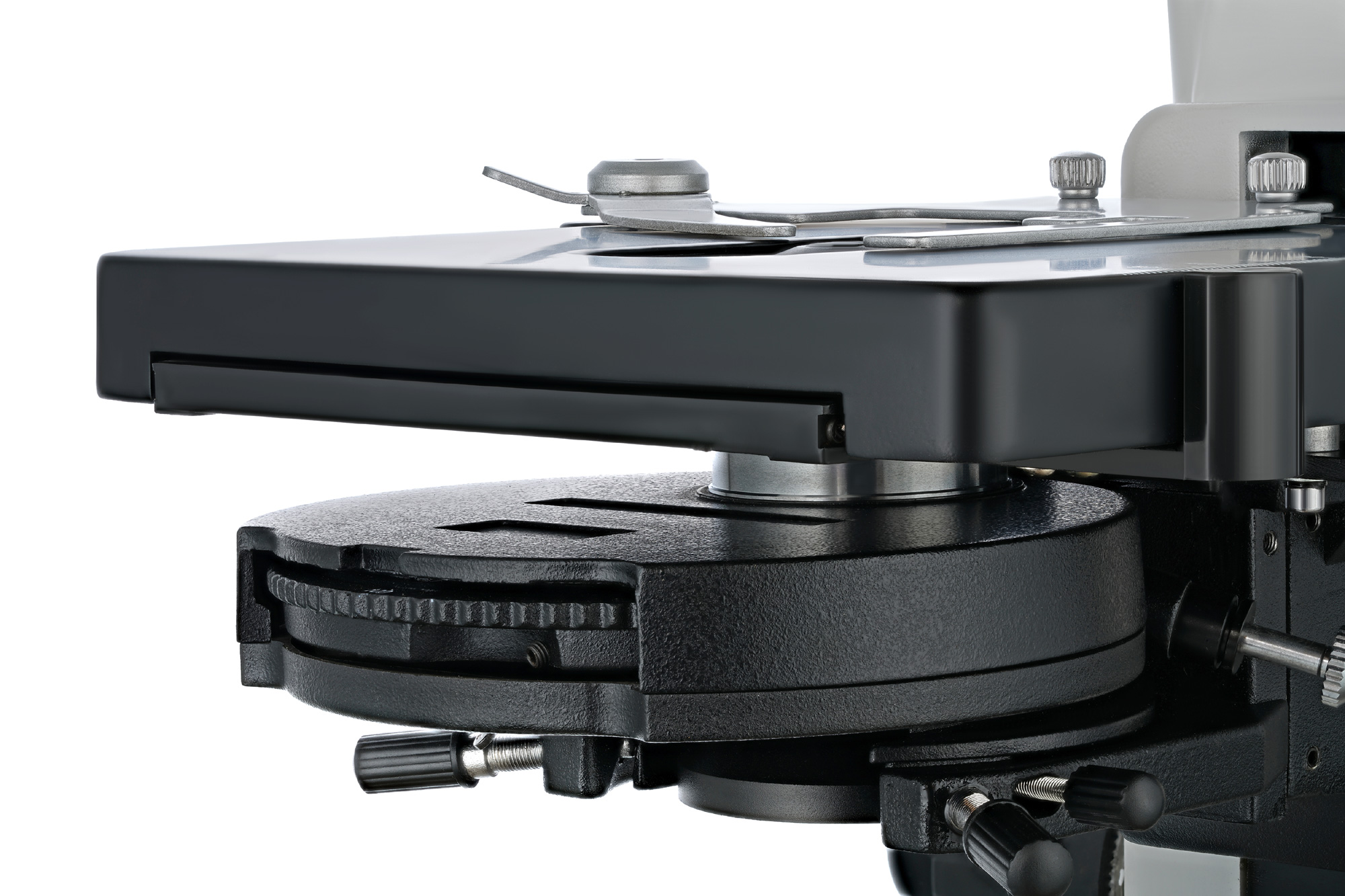 Настройка резкости производится путем вращения ручек грубой и точной фокусировки. Двуслойный механический предметный столик снабжен препаратоводителем. Столик можно перемещать по двум направлениям. Фазовый конденсор расположен ниже. Для освещения образцов используется 5-ваттный светодиод с регулировкой яркости. Можно настраивать освещение по методу Келера.