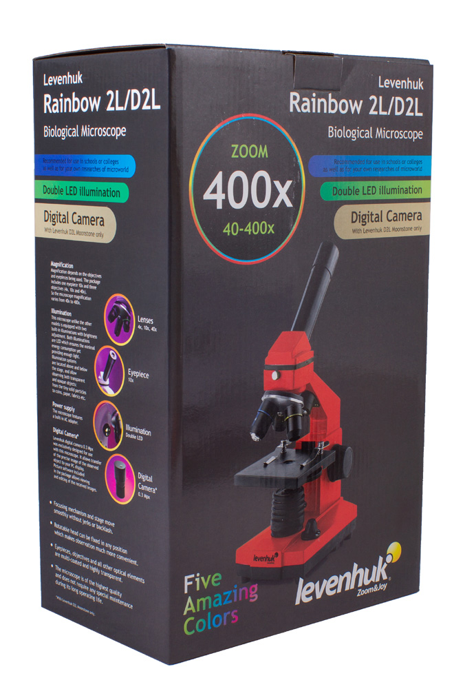 Серия Levenhuk Rainbow 2L – это пять ярких разноцветных микроскопов, которые созданы специально для юных исследователей. Каждая модель комплектуется всем необходимым для начинающего биолога – от готовых препаратов до набора для разведения живых микроскопических рачков. Микроскопы этой серии дают достаточно широкий диапазон увеличений – от 40 до 400 крат. Двойная подсветка позволяет изучить не только прозрачные, но и непрозрачные объекты. Благодаря корпусам из прочного пластика модели из линейки Levenhuk Rainbow 2L получились легкими и в то же время очень надежными – идеальное сочетание для первого учебного микроскопа. В серии есть цифровая модель с камерой 0,3 Мпикс – с ее помощью можно не только проводить исследования микропрепаратов, но и сохранять свои открытия в виде фотографий и видеозаписей.