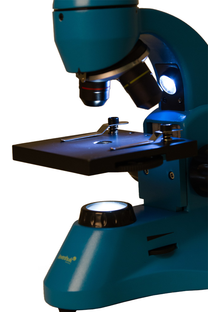 Микроскоп снабжен двумя яркими светодиодными осветителями. Нижняя подсветка нужна для исследования прозрачных препаратов, например кристаллов соли и сахара или тонких срезов растений. Чтобы рассмотреть на видимые невооруженным глазом волокна бумаги или другие непрозрачные объекты, включите верхний осветитель. Полупрозрачные препараты хорошо различимы, когда обе подсветки работают одновременно. Яркость регулируется, так что для каждого препарата легко подобрать оптимальное освещение.