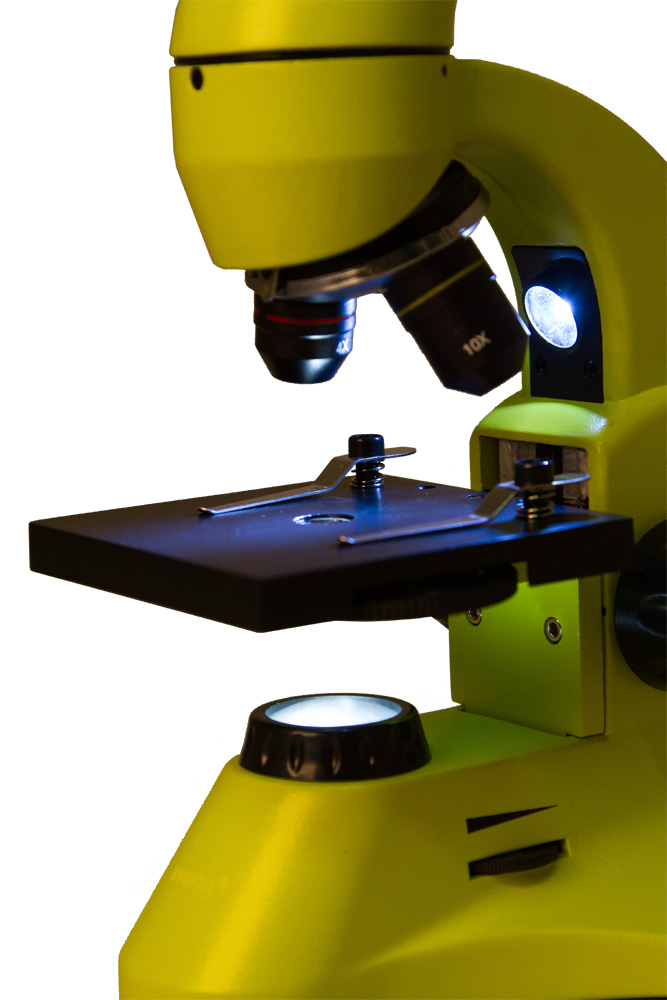 Микроскоп снабжен двумя яркими светодиодными осветителями. Нижняя подсветка нужна для исследования прозрачных препаратов, например кристаллов соли и сахара или тонких срезов растений. Чтобы рассмотреть на видимые невооруженным глазом волокна бумаги или другие непрозрачные объекты, включите верхний осветитель. Полупрозрачные препараты хорошо различимы, когда обе подсветки работают одновременно. Яркость регулируется, так что для каждого препарата легко подобрать оптимальное освещение.
