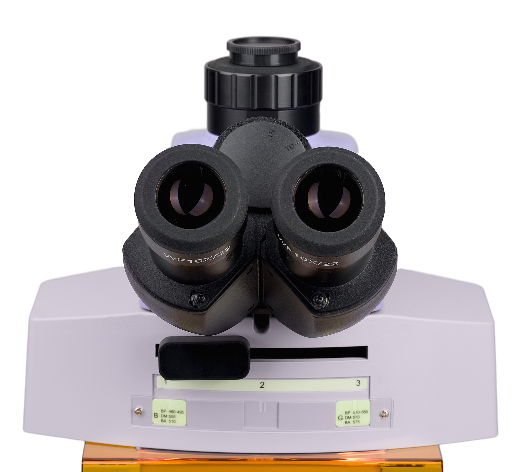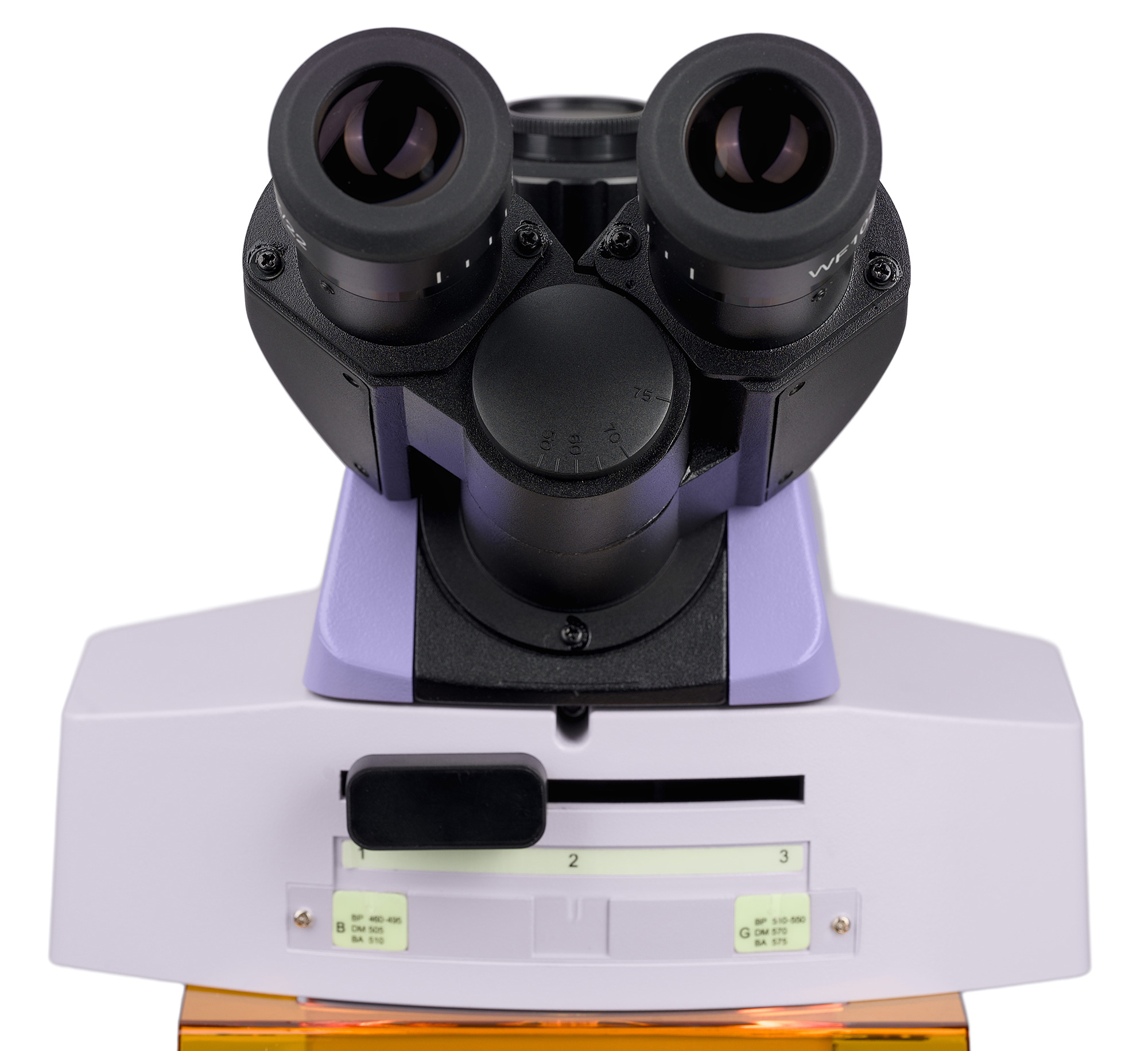 Микроскоп оснащен тринокулярной визуальной насадкой: два тубуса для окуляров, в третьем установлена цифровая камера. Окулярные тубусы созданы под оптику на бесконечность. Исследователь может настроить их положение по высоте, выкручивая тубусы на 360°. Пользователи с нарушениями зрения не имеют никаких ограничений в работе с этим микроскопом: модель комплектуется базовыми окулярами 10х/22 мм с кольцами диоптрийной подстройки, а выходной зрачок на окулярах вынесен на достаточное расстояние, чтобы можно было вести исследование в очках. Линзы очков и окуляров защищают плоские резиновые наглазники. При подключении камеры световой поток в микроскопе равен 50/50.