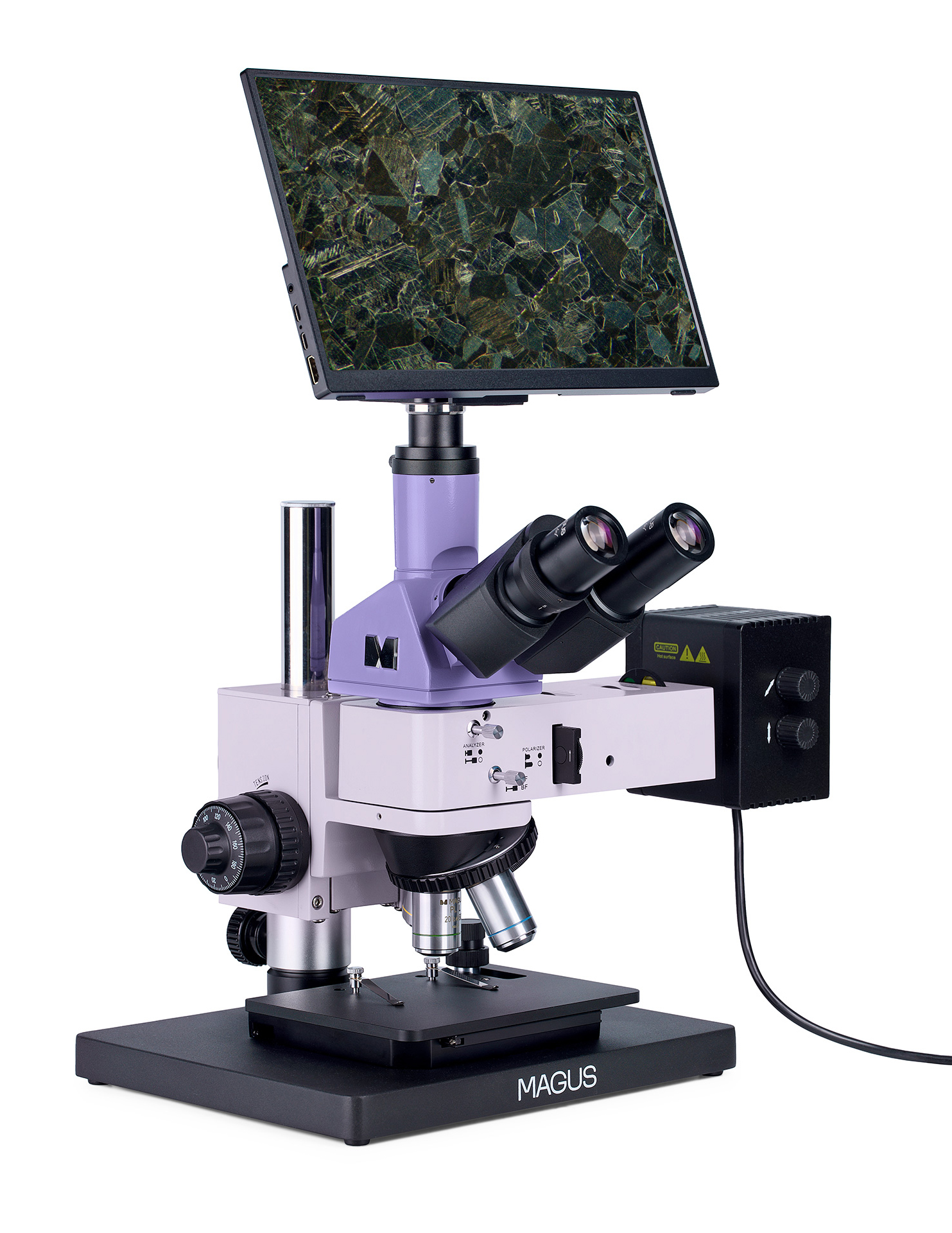 Микроскоп оснащен электрическим анализатором и съемным поляризатором. Поляризатор вращается в пределах 0–360°, анализатор не вращается. При помощи апертурной диафрагмы и полевой диафрагмы нанесите вред освещению по методу Кёлера. Обе диафрагмы и источник света центрируются. Есть набор светофильтров. Устройство для работы по методу темного поля встроено в насадку осветителя отражающего света.