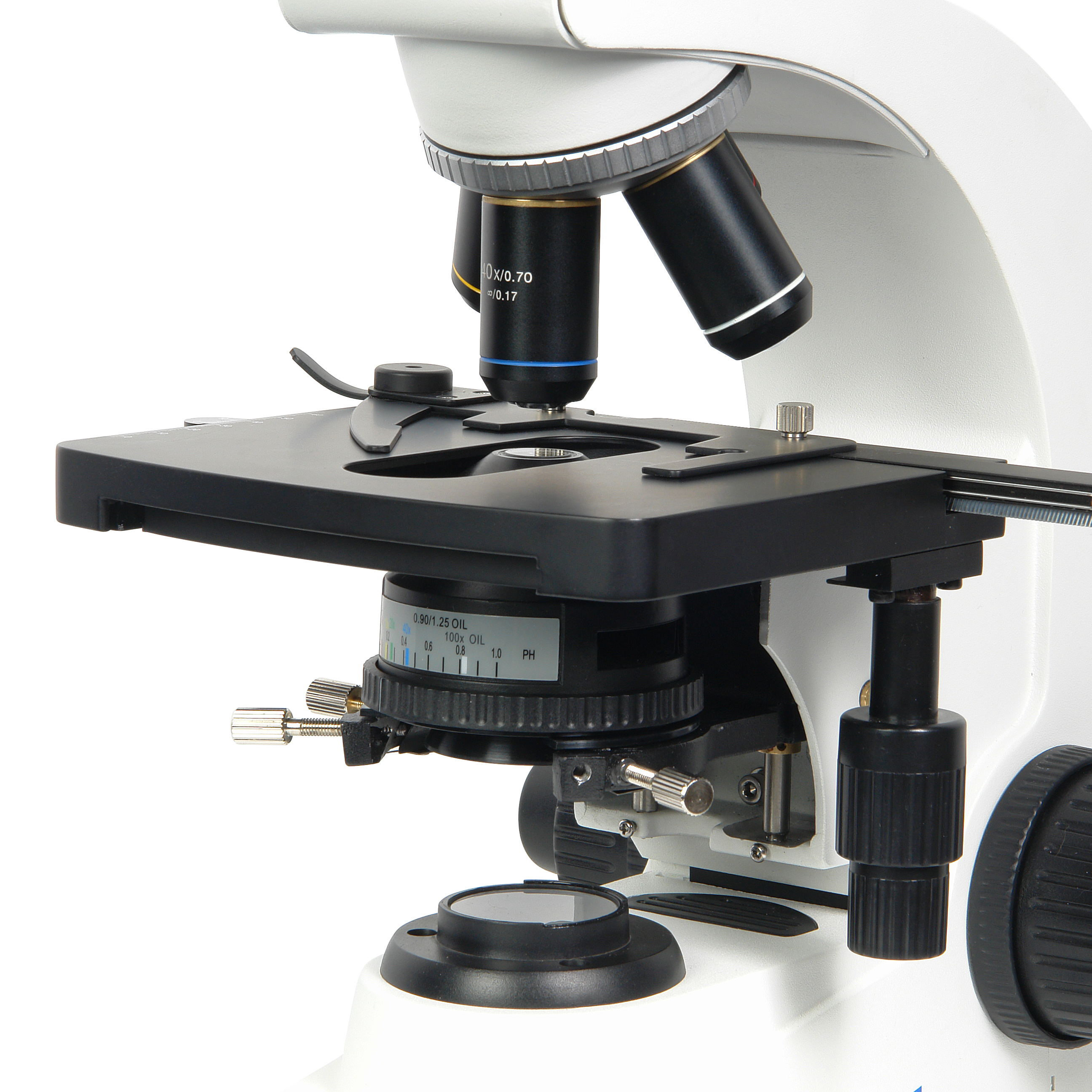 В комплект поставки микроскопа Микромед 1 (3-20 inf.) входят объективы с ахроматической коррекцией для сухих исследований – 4x/0.13, 10x/0.30, 40x/0.70 и объектив для исследований с масляной иммерсией 100x/1.25 oil. По дополнительному заказу может быть поставлен объектив 60х/0.80. Объективы 40x/0.70 и 100x/1.25 oil имеют оправы с подпружиненными оптическими блоками, что препятствует повреждению оптики объектива и изучаемого образца. Высокое оптическое качество объективов обеспечивает информативность и комфорт при исследованиях и отличное качество записываемых изображений. Все объективы парфокальны, поэтому при смене увеличений не теряется наводка на резкость. Объективы микроскопа установлены на револьверном устройстве, рассчитанном на 4 объектива, что позволяет наблюдателю быстро переходить к исследованиям с различными увеличениями.