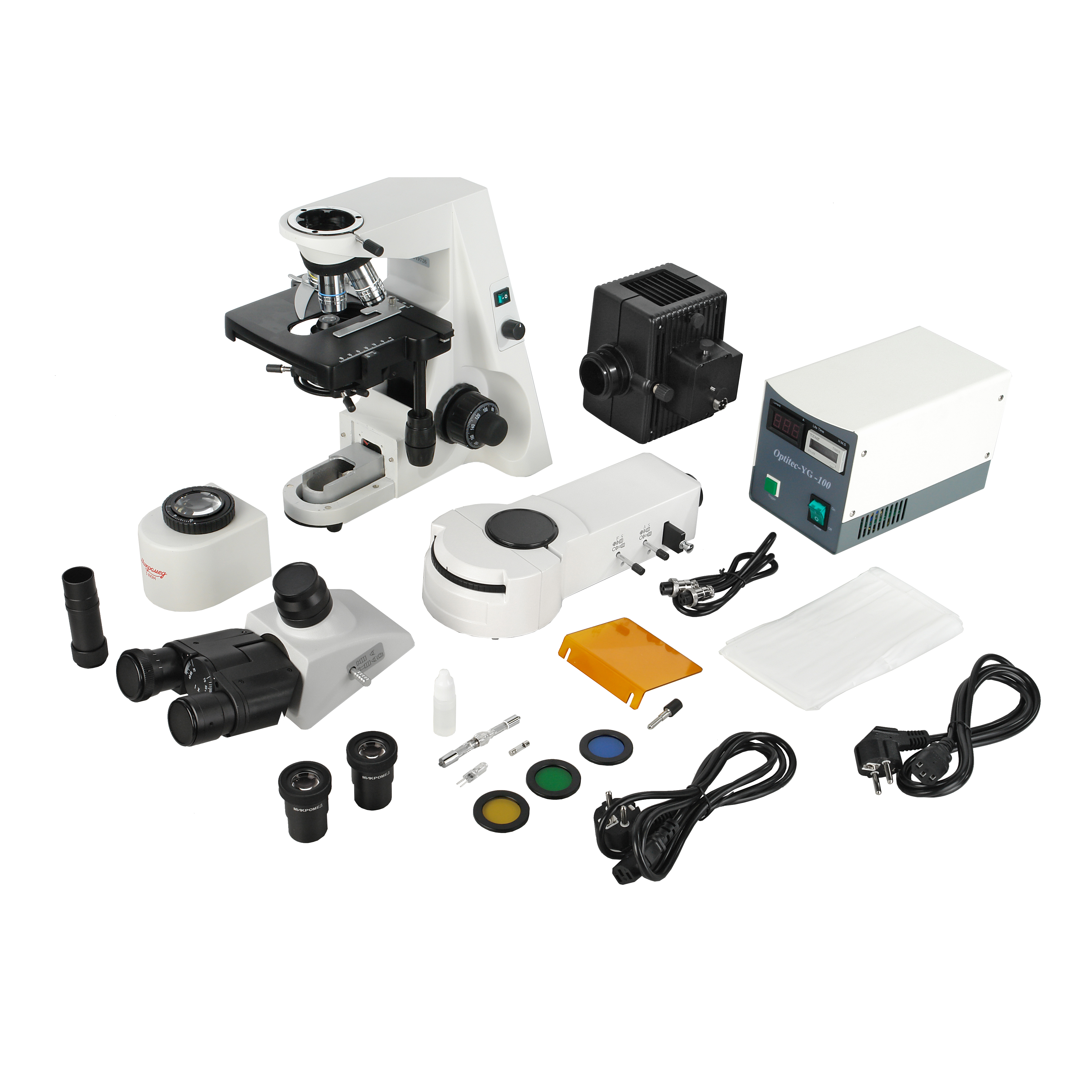 Люминесцентная насадка микроскопа состоит из фонаря с ртутной лампой, установленной на регулируемый по 3-м направлениям держатель, зеркала лампы, коллектора и полевой диафрагмы. В корпусе насадки размещены апертурная диафрагма, переключаемые люминесцентные блоки G и B и выдвижной светофильтр. Поджиг и питание ртутной лампы осуществляется от выносного блока питания. В осветительную систему светлого поля входит центрируемый конденсор Аббе с апертурной диафрагмой, коллектор с полевой диафрагмой и галогенная лампа с регулируемой яркостью. Блок питания встроен в основание микроскопа.