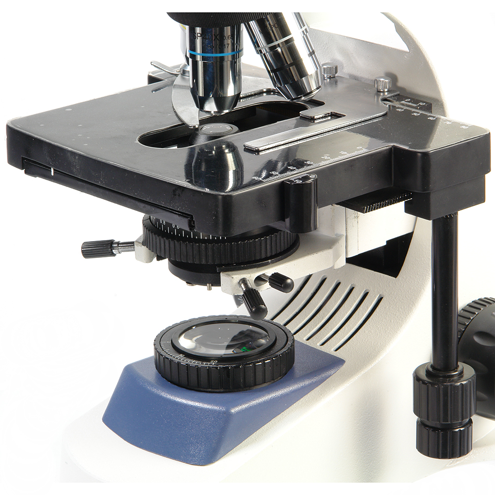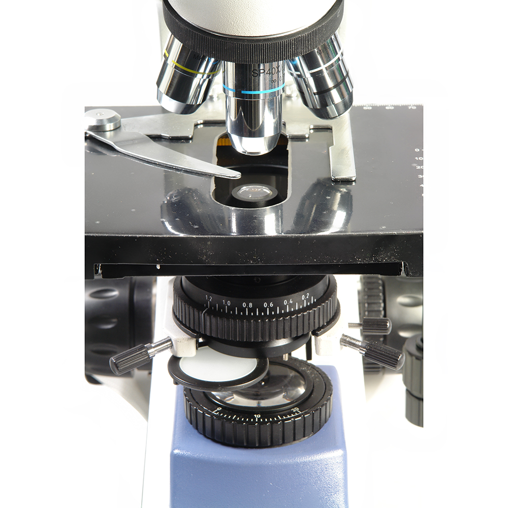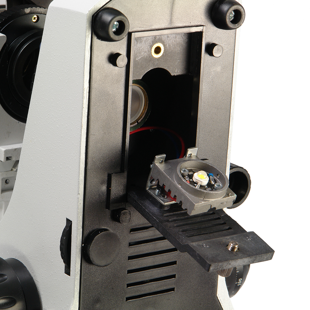 В микроскопе используется классический тип освещения по Келлеру. Светодиодная подсветка расположена под предметным столиком, для регулирования светового пучка применяется центрируемый конденсор Аббе и полевая диафрагма. Коаксиальный механизм грубой и точной фокусировки дает возможность точно настроить резкость на исследуемом образце. Предметный столик можно перемещать по двум осям.