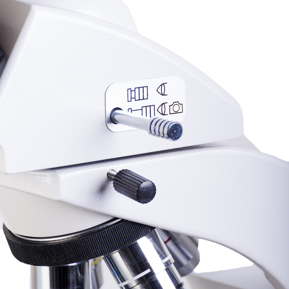 Тринокулярную насадку микроскопа можно использовать для визуальных наблюдений и для установки цифровой камеры (в комплекте нет). Насадка вращается на 360°, что позволяет без труда найти идеальное положение для наблюдений. Оптическая схема состоит из 5 ахроматических объективов разной кратности, которые дают фиксированные увеличения в диапазоне от 40 до 1000 крат. Широкопольные окуляры имеют удаленный зрачок и корректировку диоптрий.