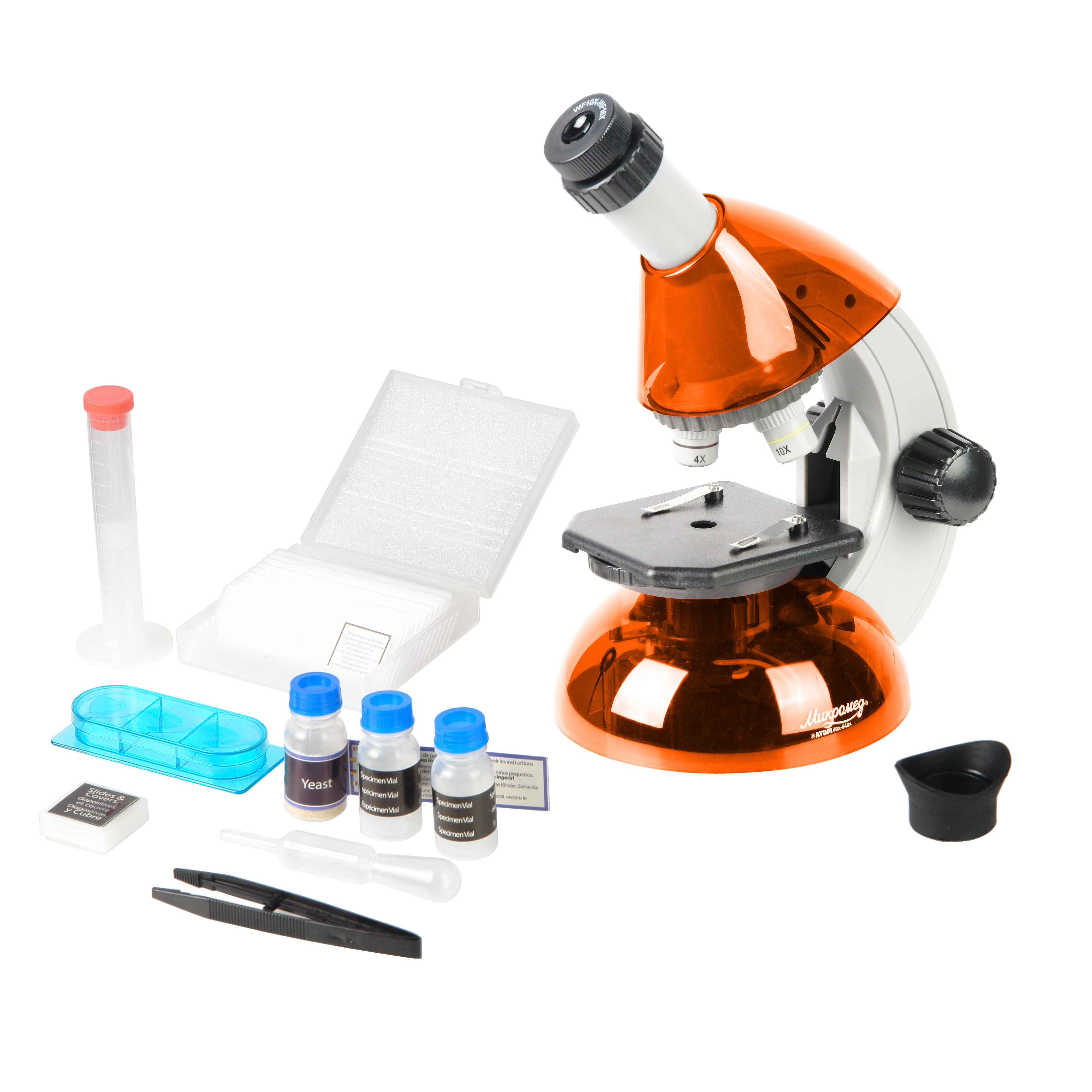микроскопа. Кроме микроскопа в коробке находятся предметные и покровные стекла, пинцет, инкубатор и другие полезные принадлежности для того, чтобы незамедлительно приступить к наблюдению. Все стеклянные детали комплекта, могущие представлять опасность для ребенка изготовлены из безопасных полимерных материалов.