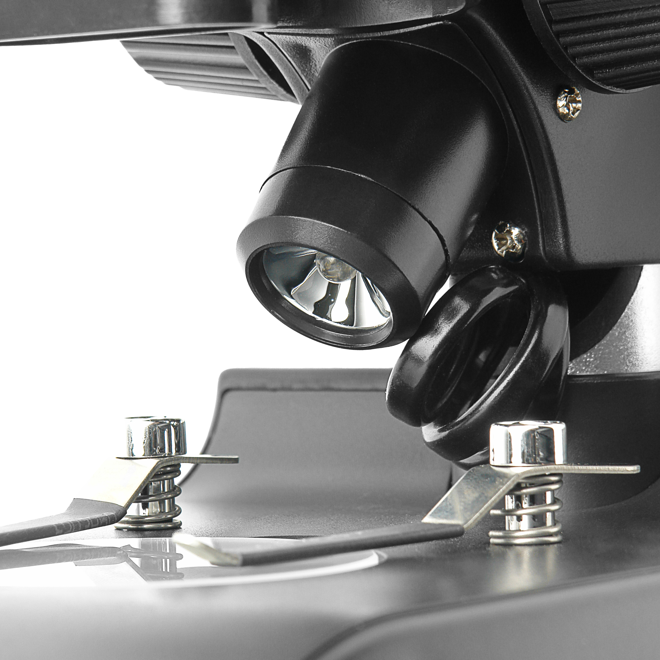Фокусировка микроскопа производится перемещением визуальной насадки по вертикали с помощью точного реечного механизма.