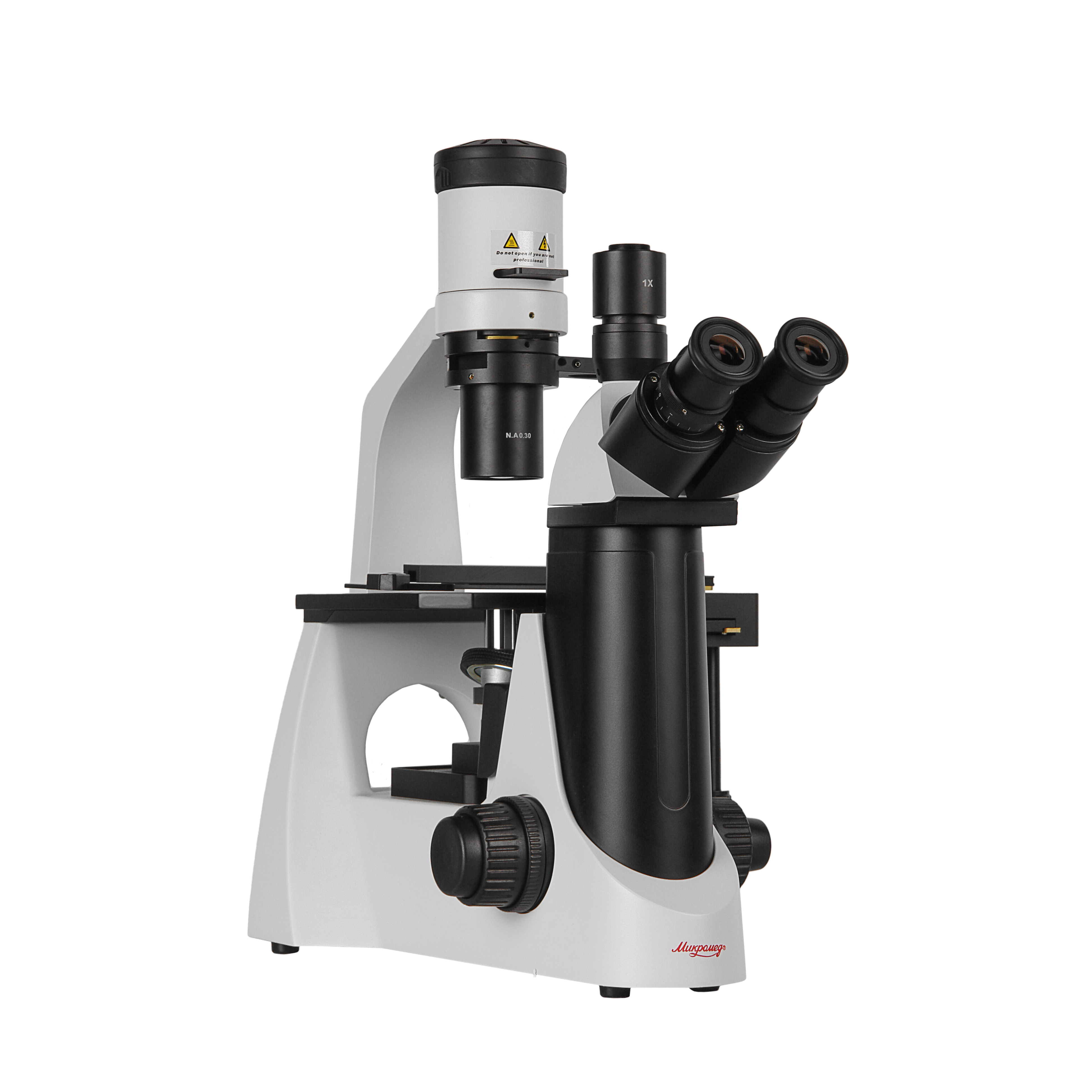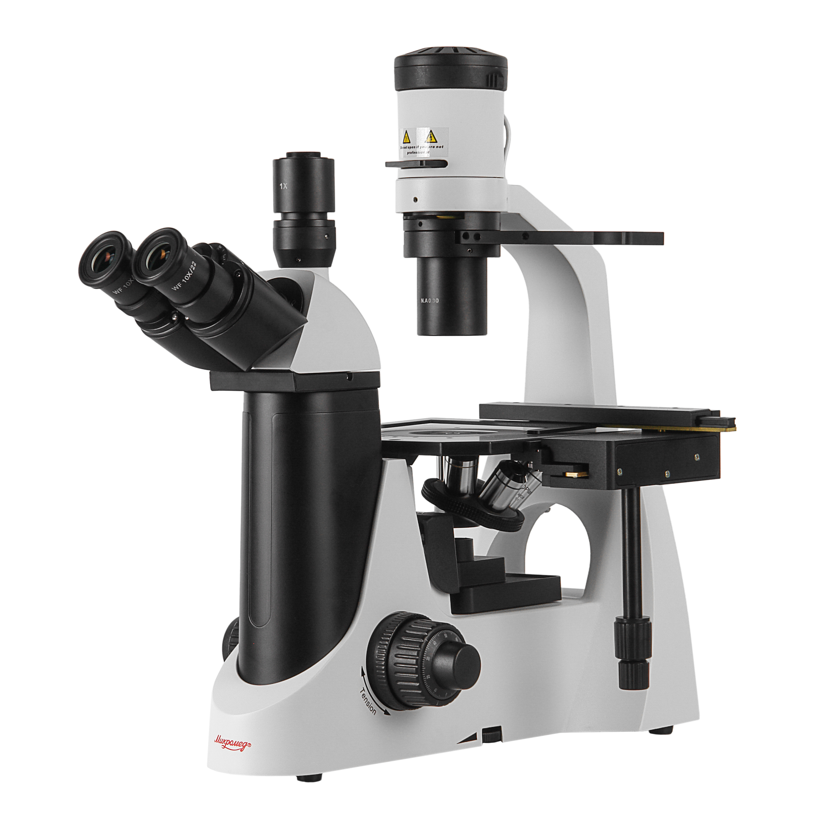 Микроскоп построен по оптической схеме «бесконечность» и включает визуальную насадку с окулярными тубусами и каналом визуализации, объективы и конденсорный осветитель проходящего света на мощном светодиоде, предназначенный как для работы методом светлого поля, так и методом фазового контраста.