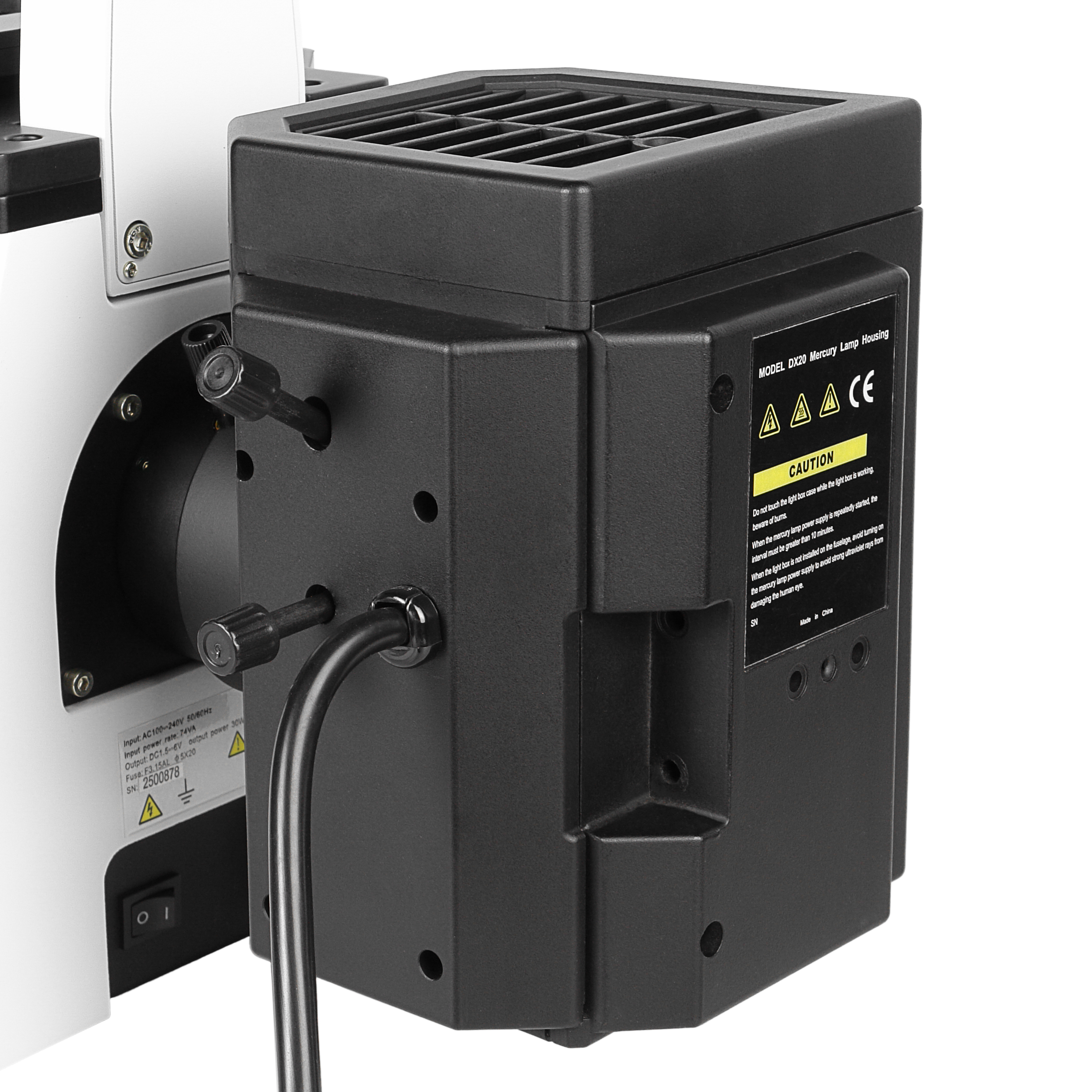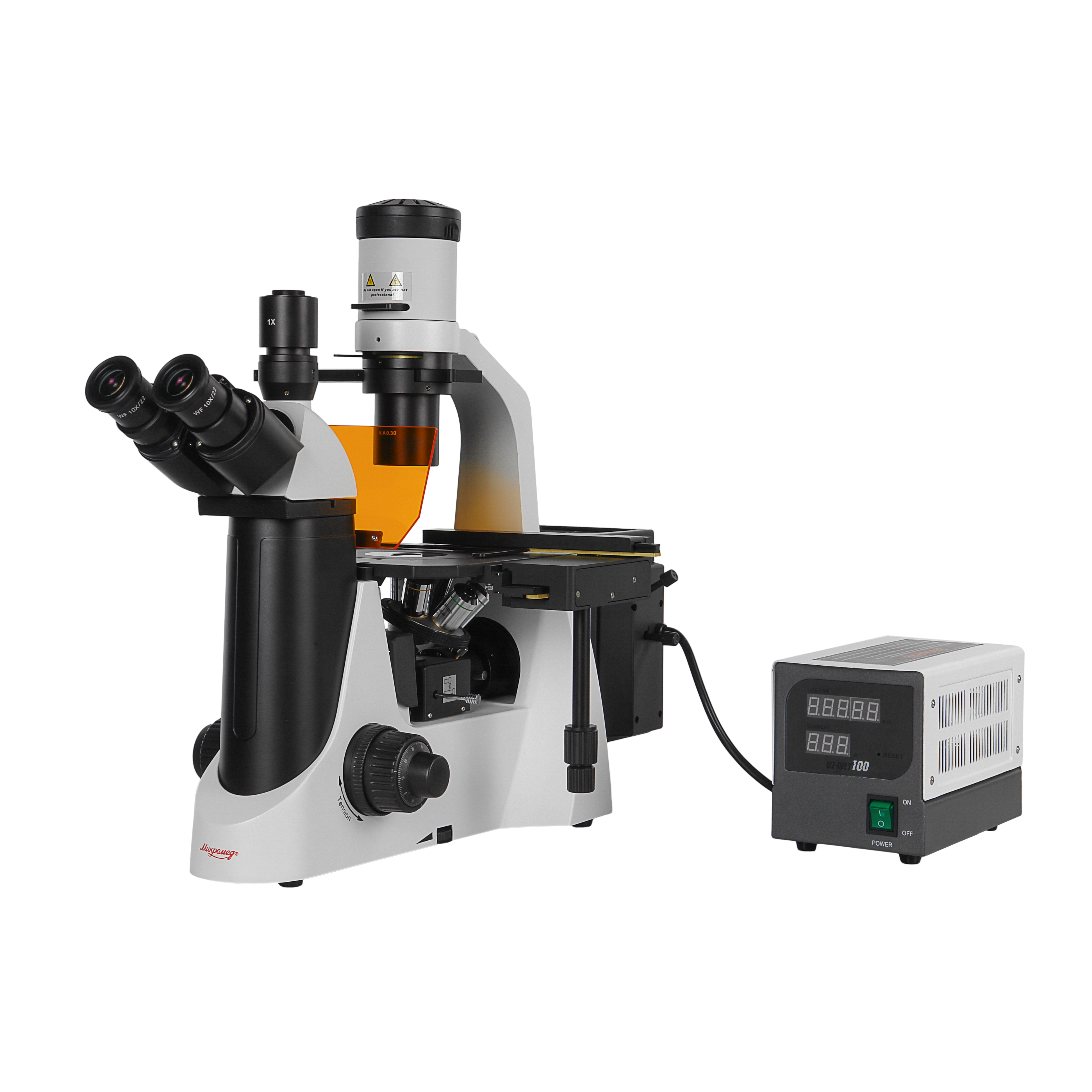 В качестве источника света применена ртутная лампа со спектром излучения, смещенным в УФ-область. Лампа расположена в вынесенном фонаре и снабжена устройствами центрировки. Подобная конфигурация осветителя препятствует избыточному нагреву как препарата, так и оптики микроскопа. Устройство питания и поджига лампы выполнено в виде внешнего блока, подключаемого к сети 100-240 В / 50-60 Гц. Блок оборудован счетчиком времени свечения лампы.