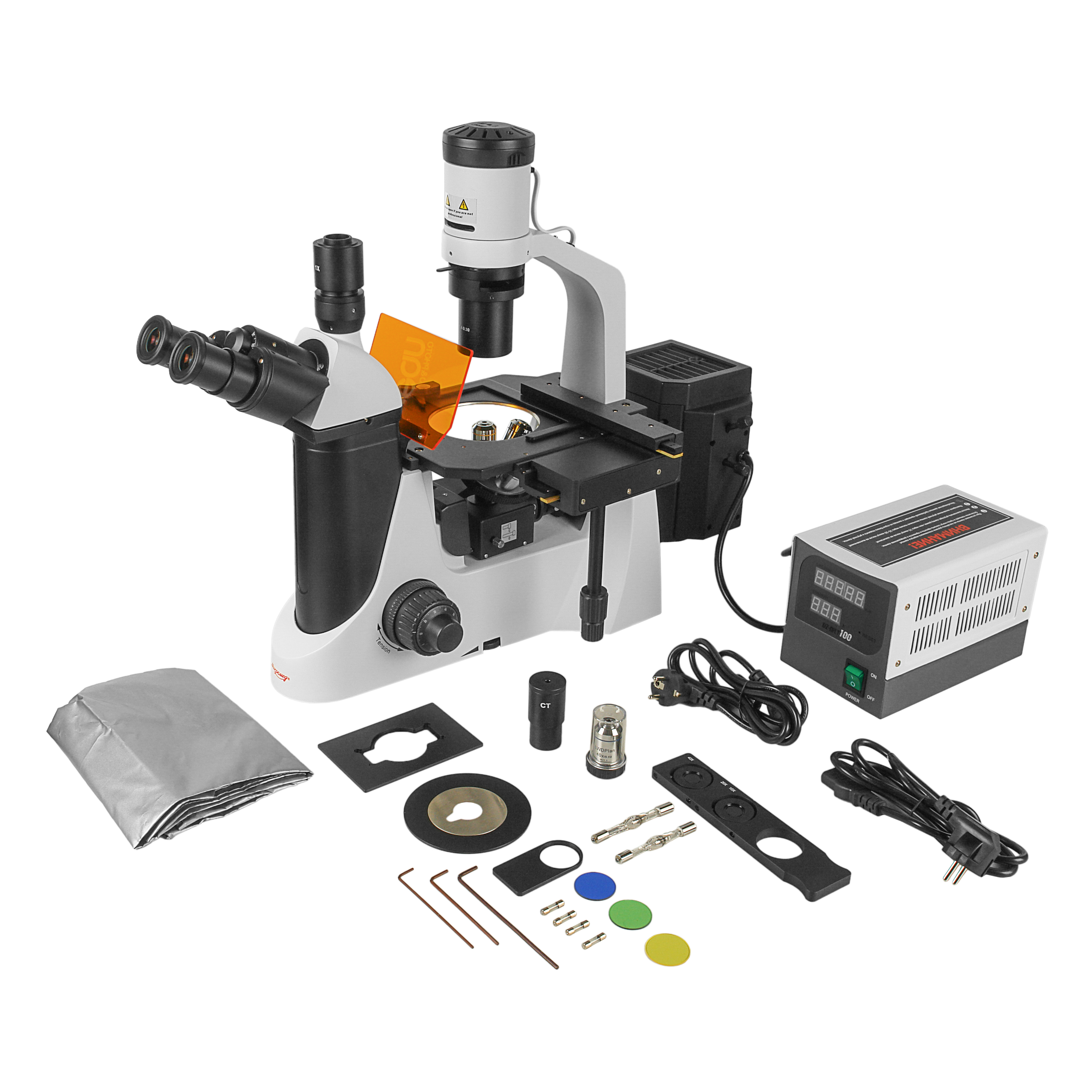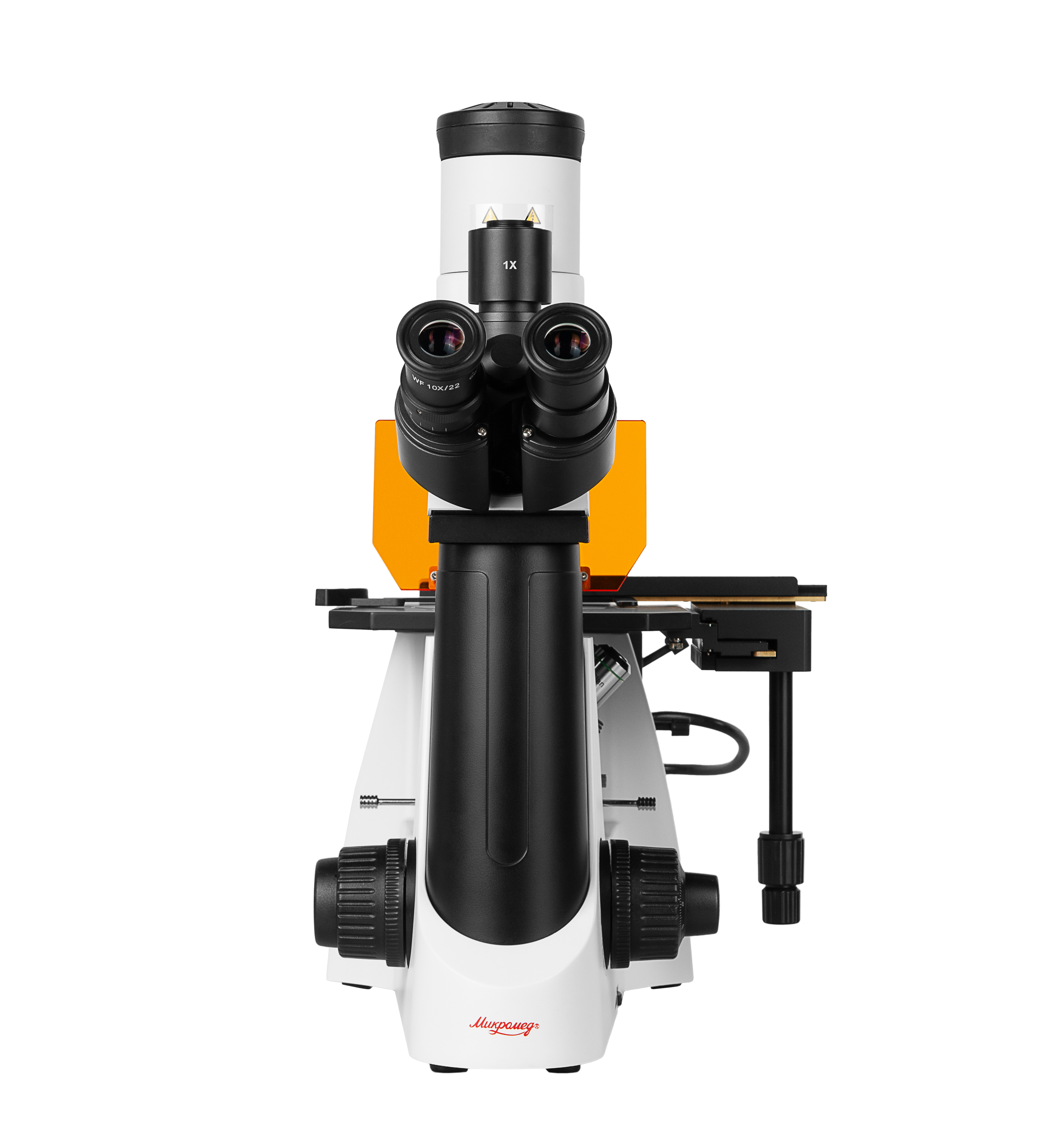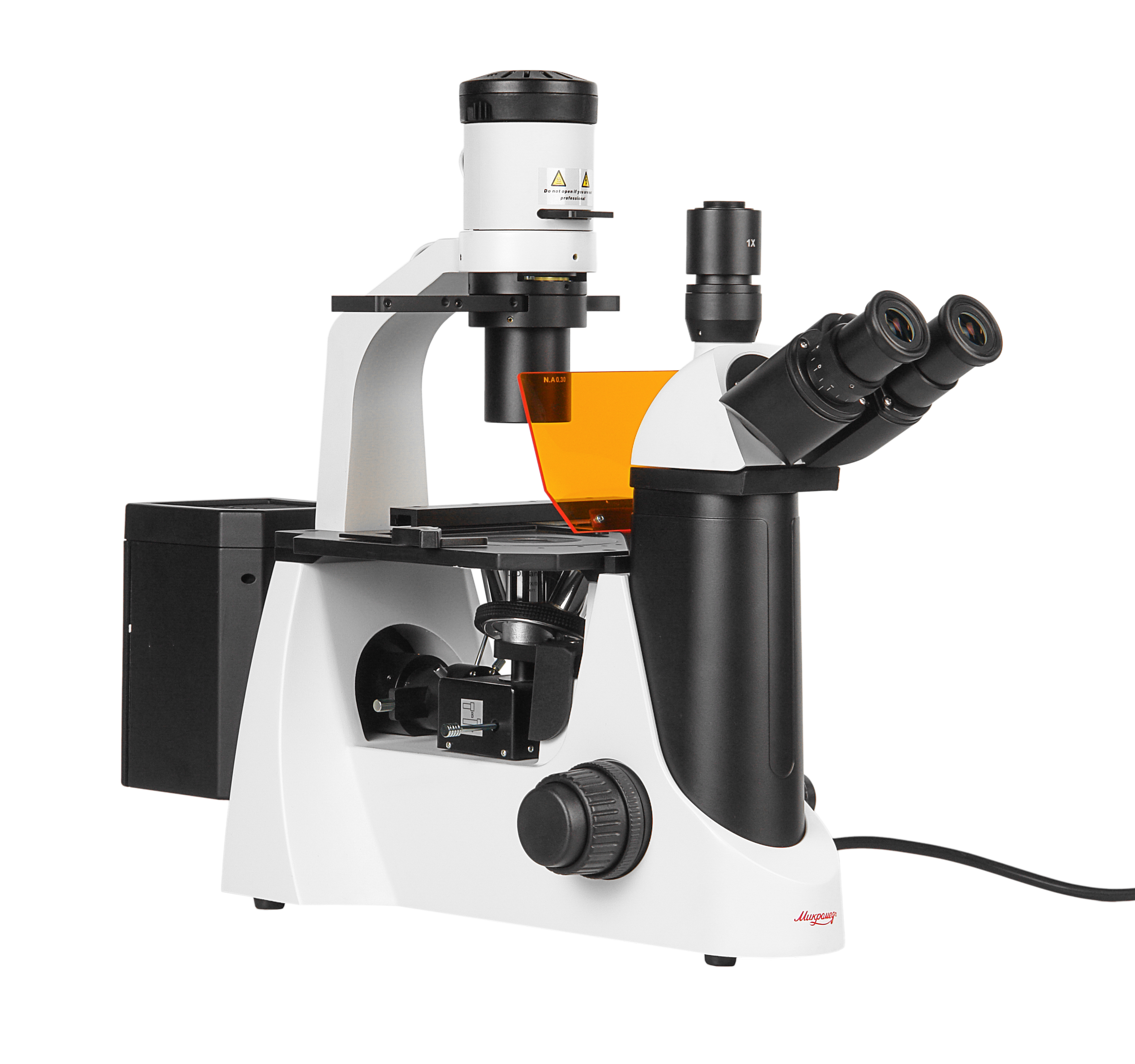 - Инвертированный штатив со встроенным в основание блоком питания, неподвижным предметным столиком и механизмом фокусировки